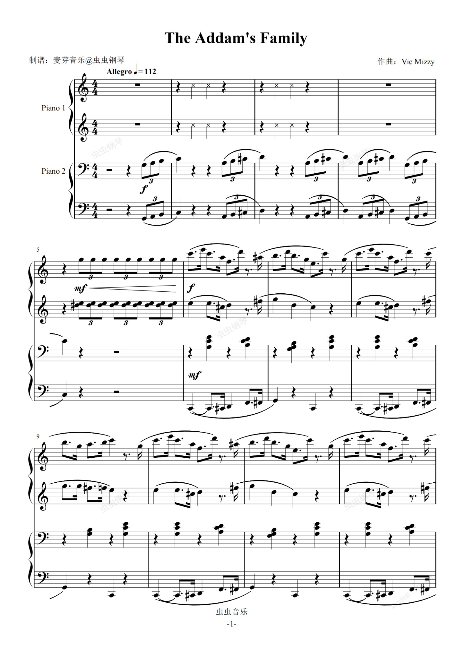 钢琴谱:The Addam's Family 亚当斯一家 四手联弹