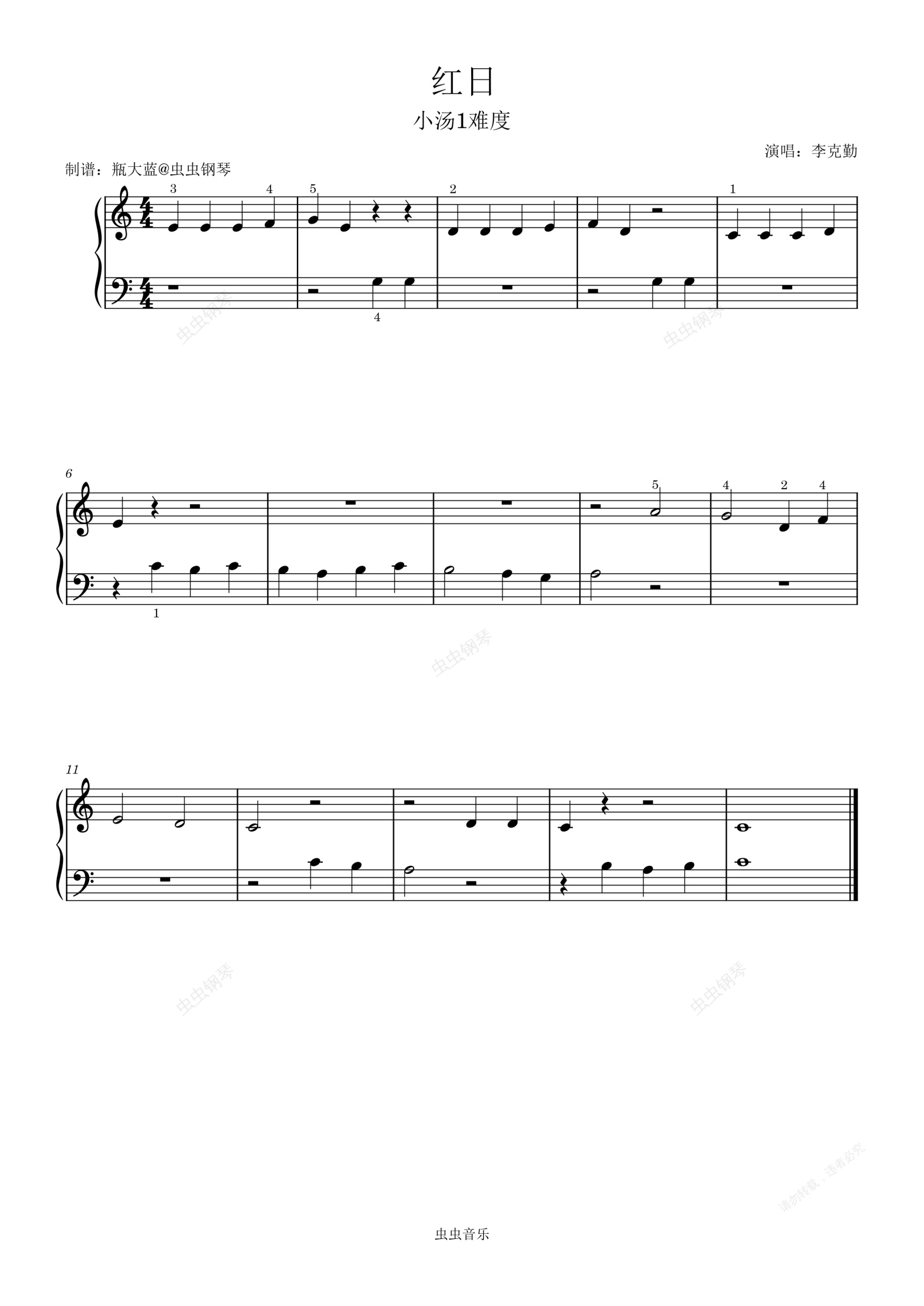 钢琴谱:《红日》-小汤1难度
