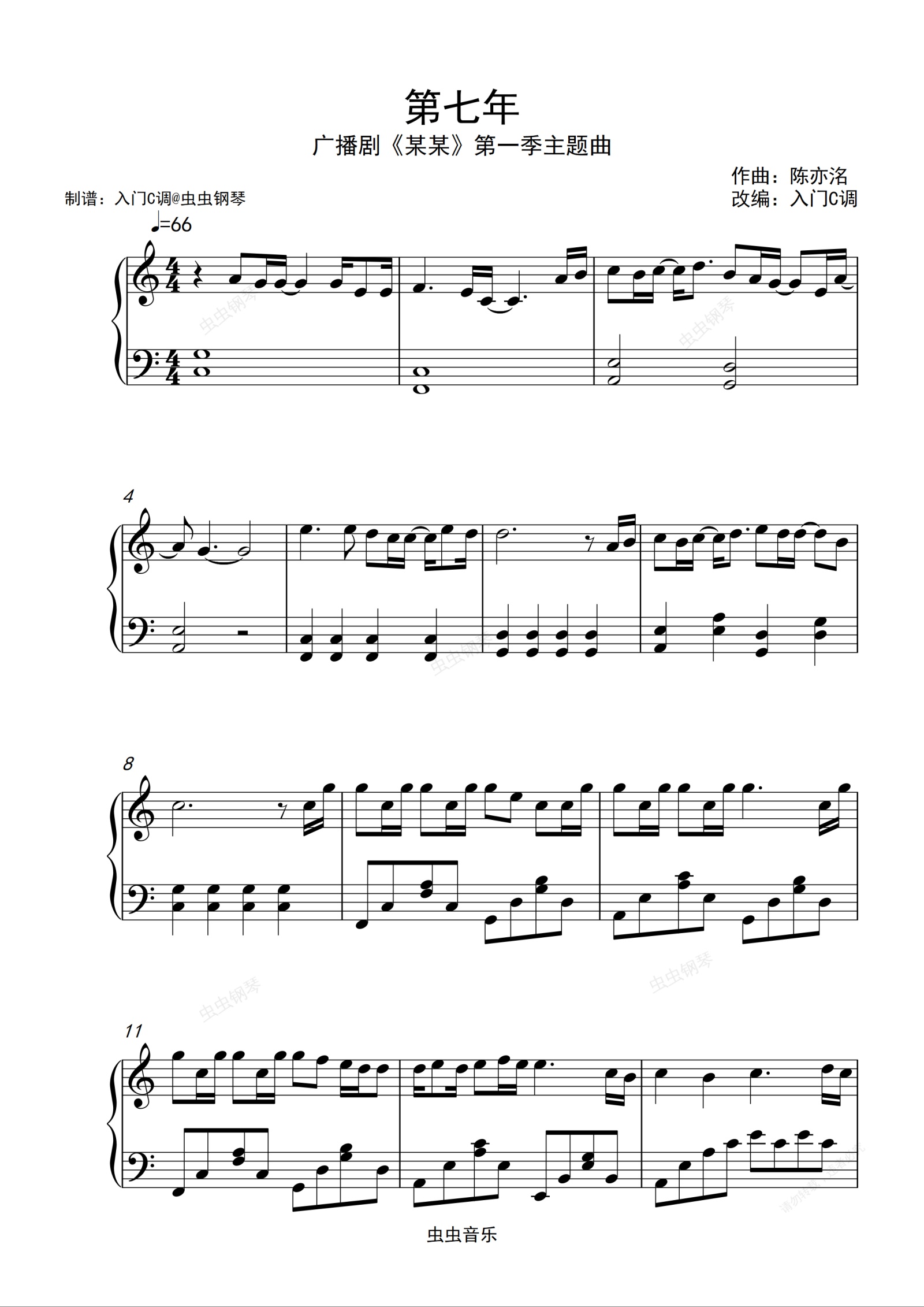 钢琴谱:《第七年》(广播剧《某某》第一季主题曲)入门C调抒情版