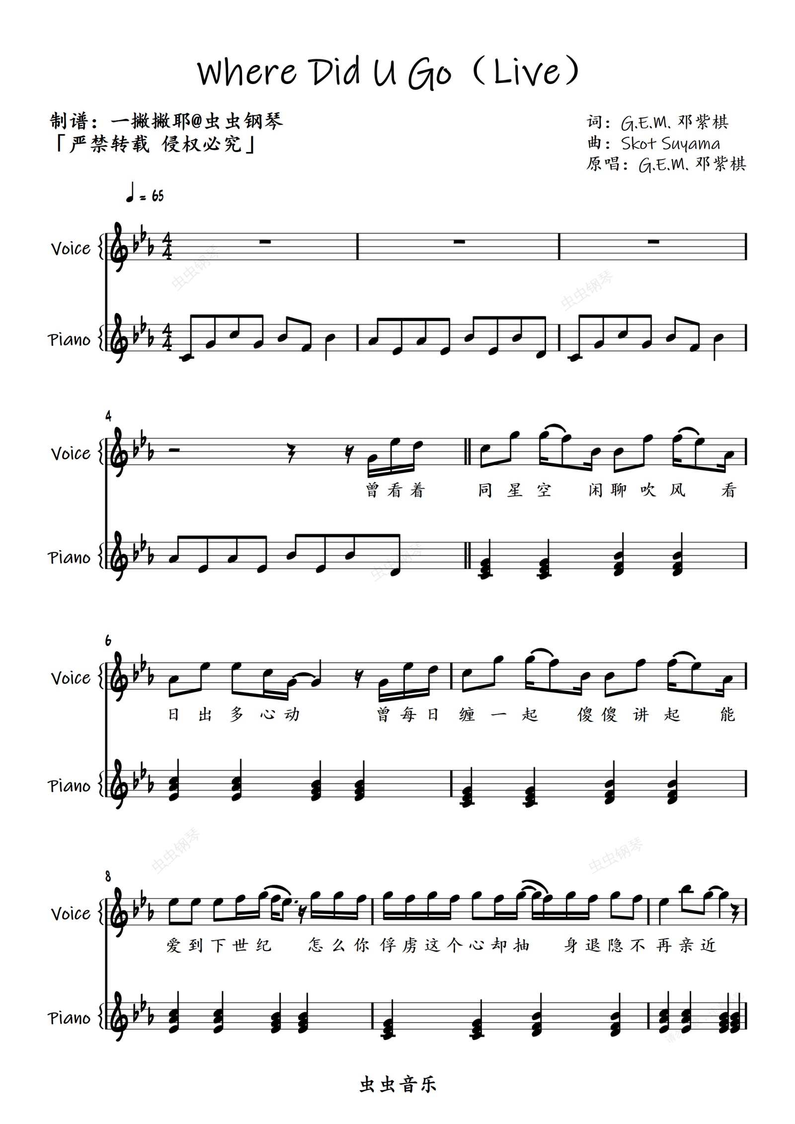 钢琴谱:极简版15键琴弹唱《Where Did U Go》邓紫棋「一撇撇耶」