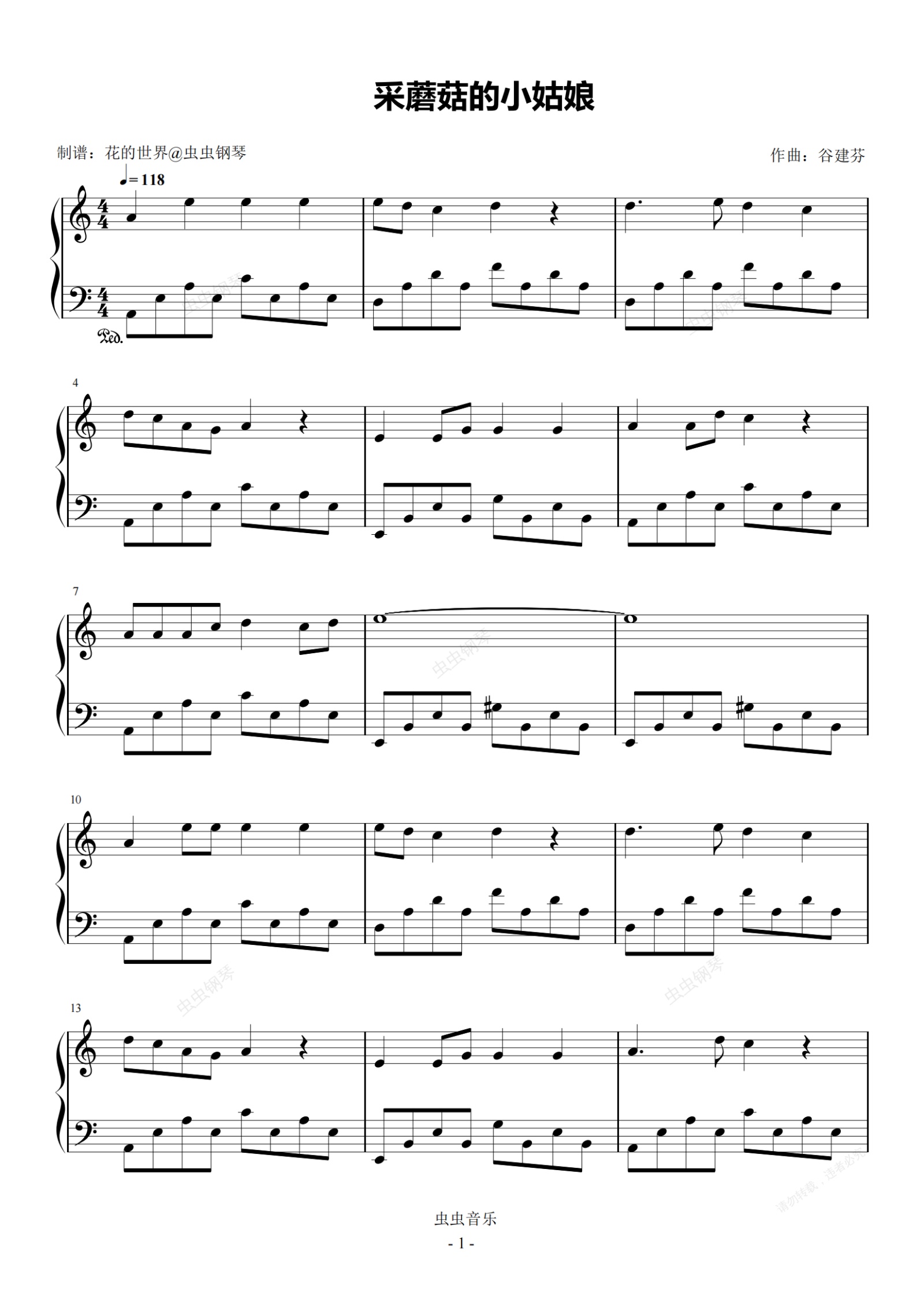 钢琴谱:采蘑菇的小姑娘 C调简易版 经典儿歌