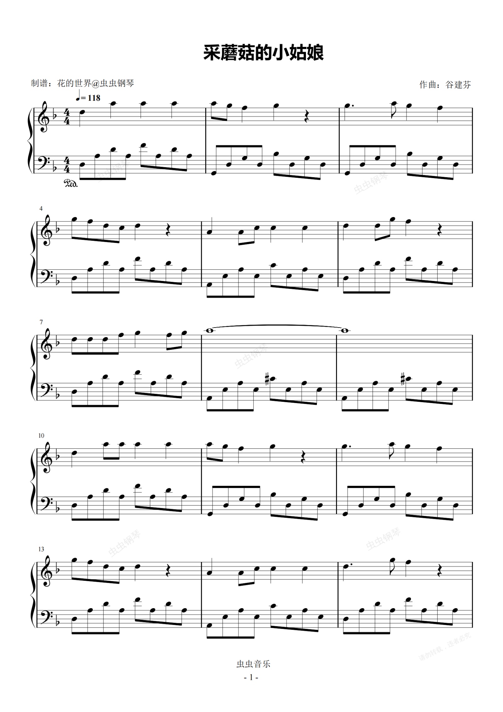 钢琴谱:采蘑菇的小姑娘 原调简易  经典儿歌