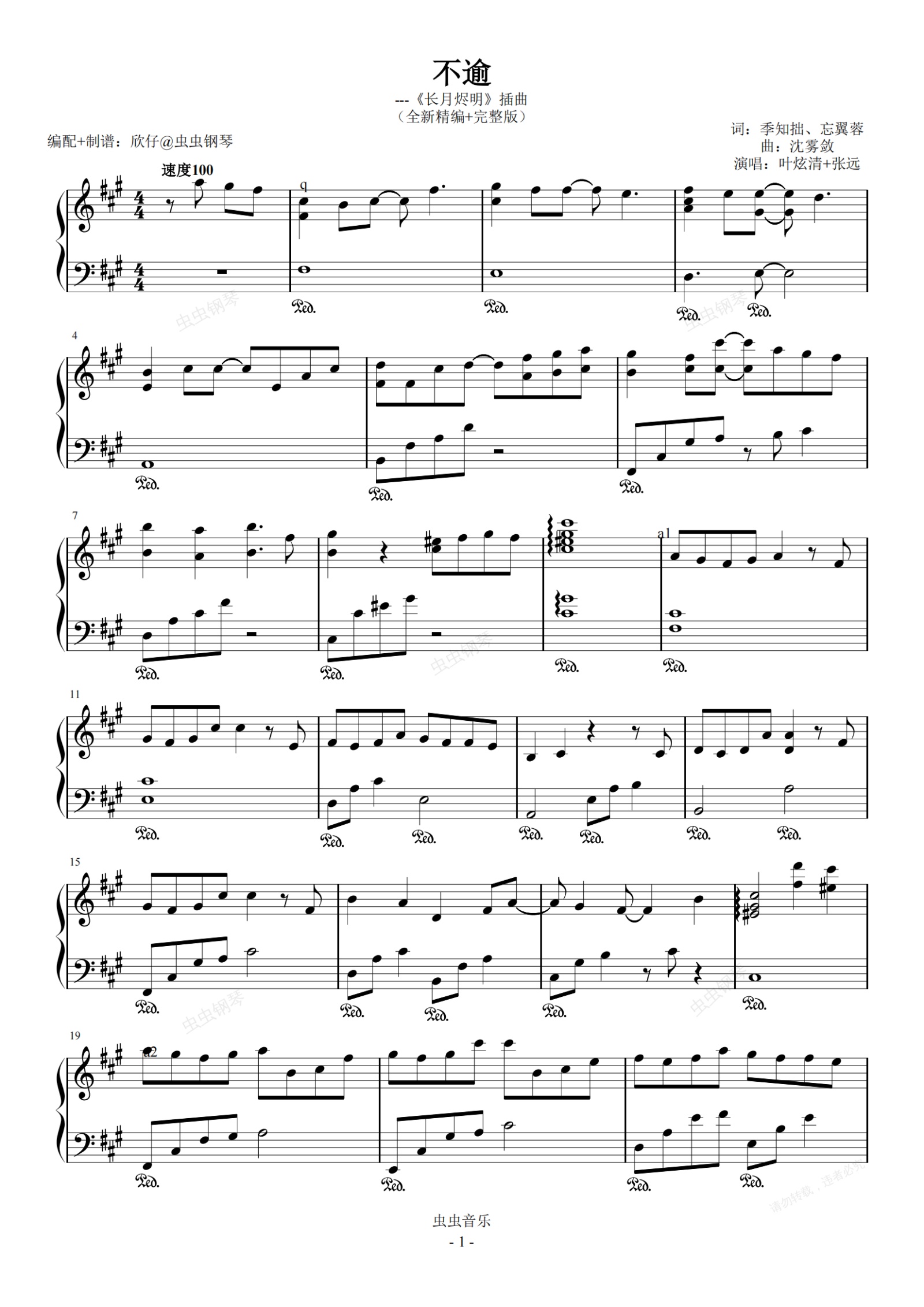 钢琴谱:A-《不逾》(《长月烬明》插曲、叶炫清&张远、全新精编+完整版)