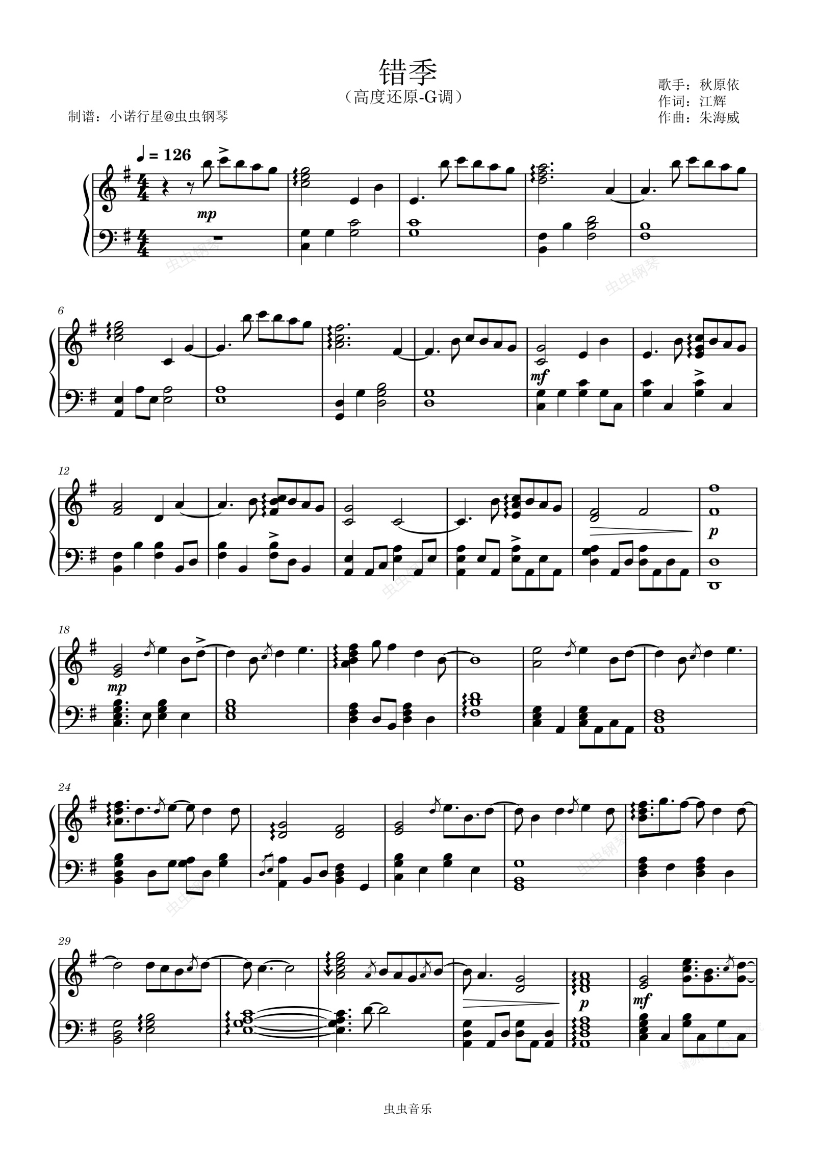 钢琴谱:错季-华丽高燃 G调钢琴独奏