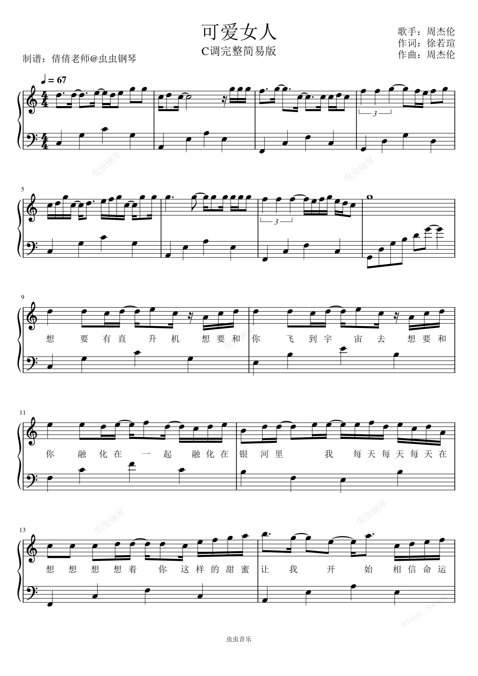 钢琴谱:可爱女人-C调完整简易版-周杰伦