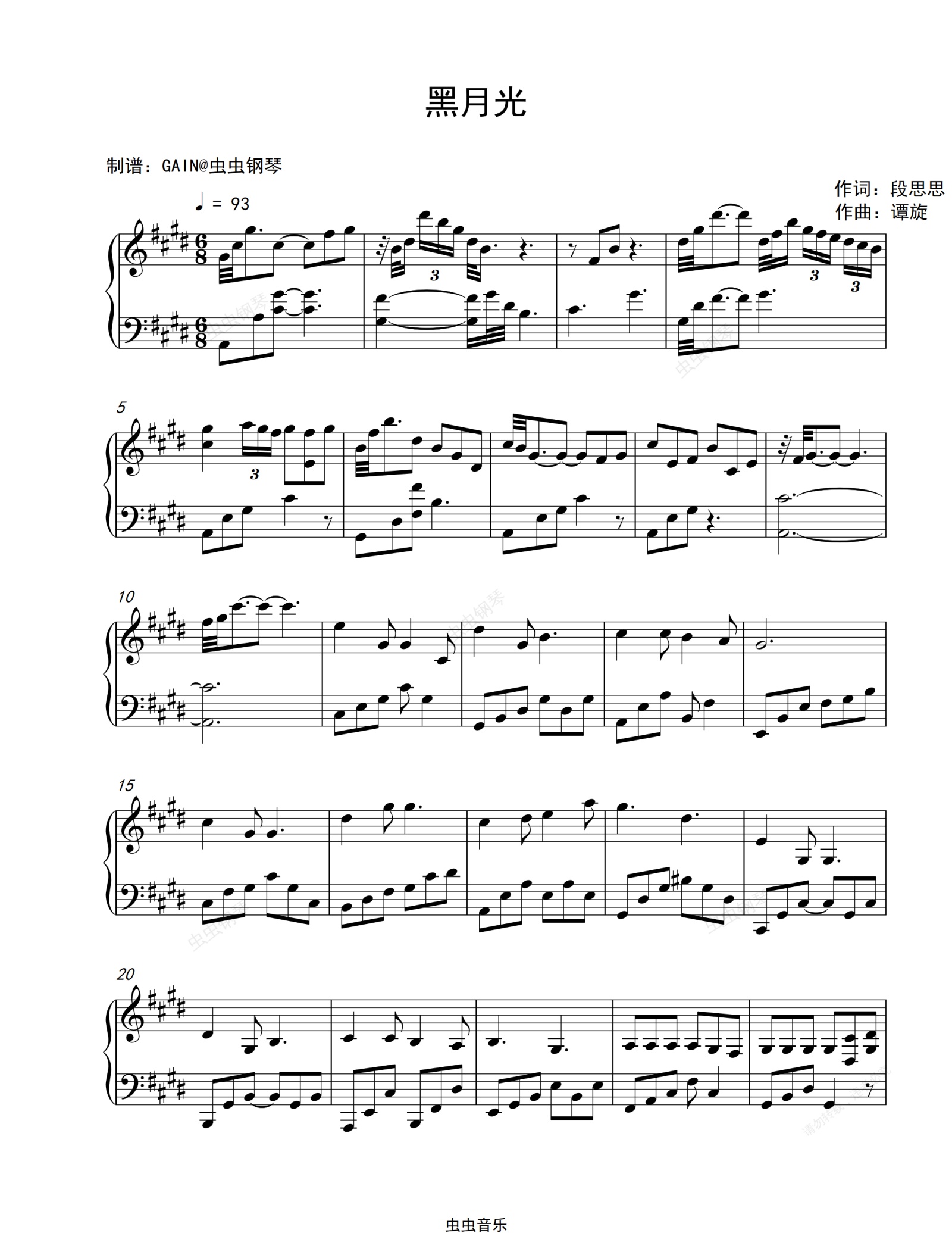 钢琴谱:黑月光-长月烬明片尾曲-张碧晨 /毛不易