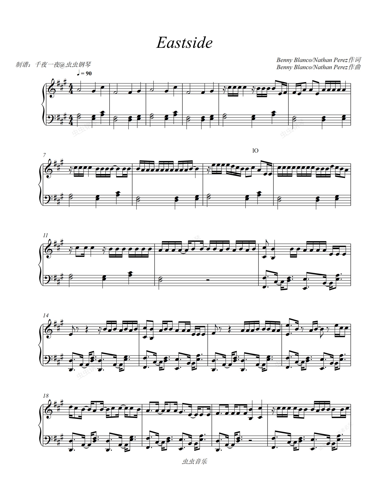 钢琴谱:Eastside - Benny blanco, Halsey & Khalid