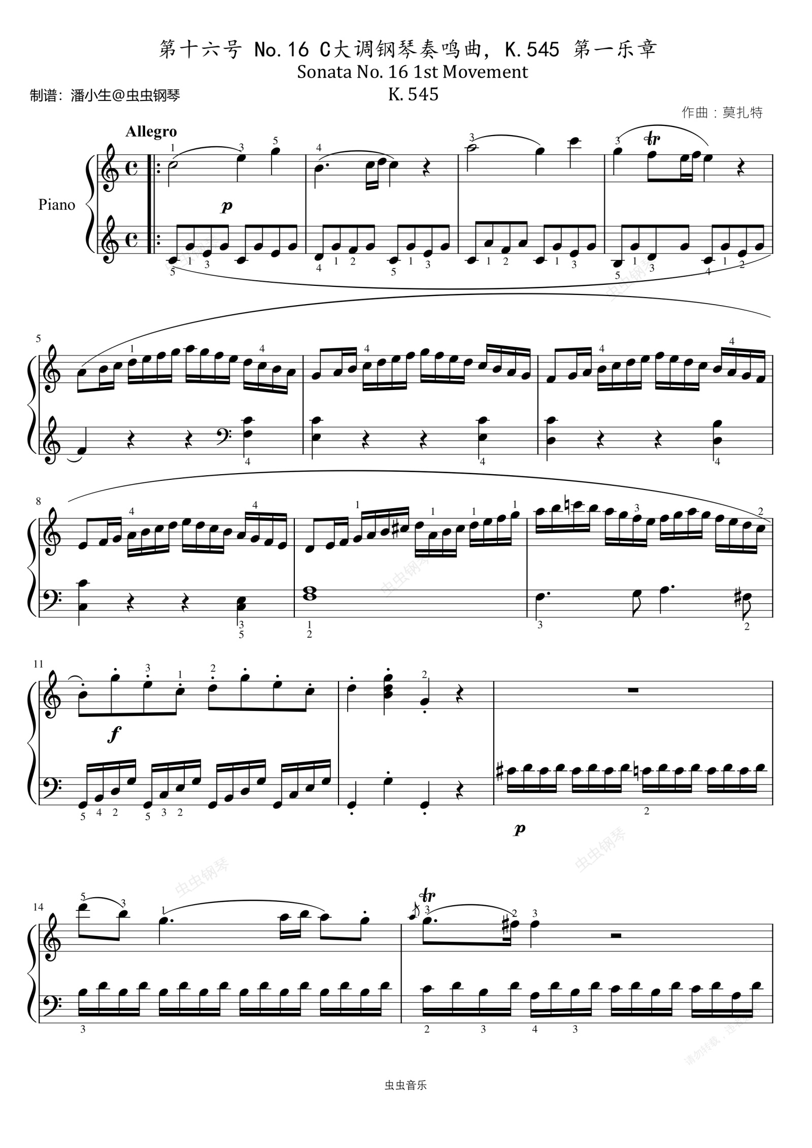 钢琴谱:莫扎特 第十六号 No.16 C大调钢琴奏鸣曲, K.545 第一乐章 原版带指法