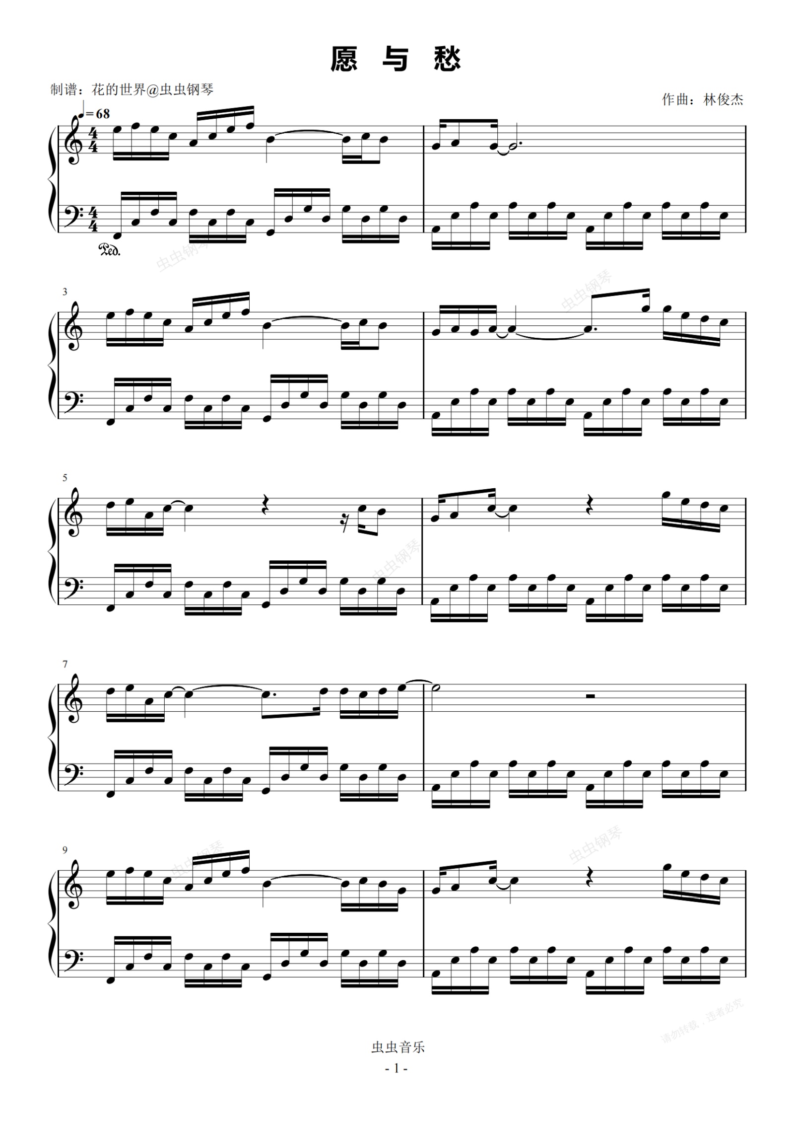 钢琴谱:愿与愁 C调简易版 林俊杰