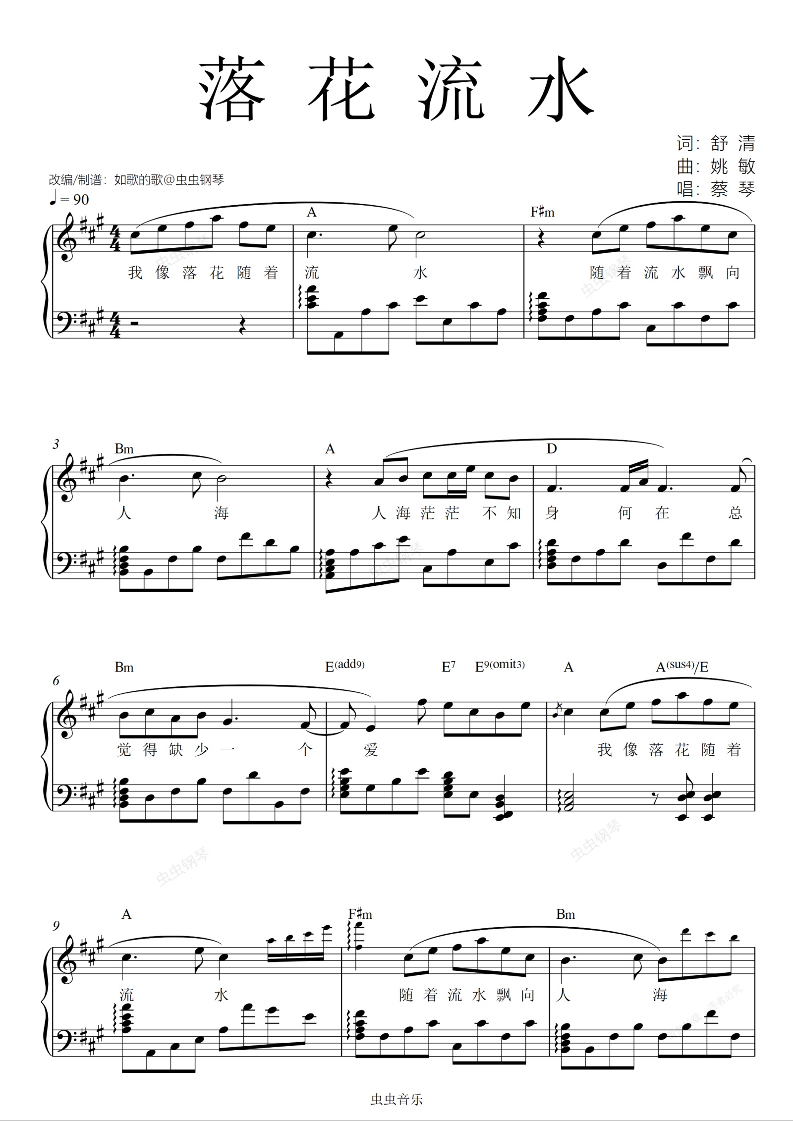 钢琴谱:落花流水-蔡琴原调复刻附词功能可弹唱
