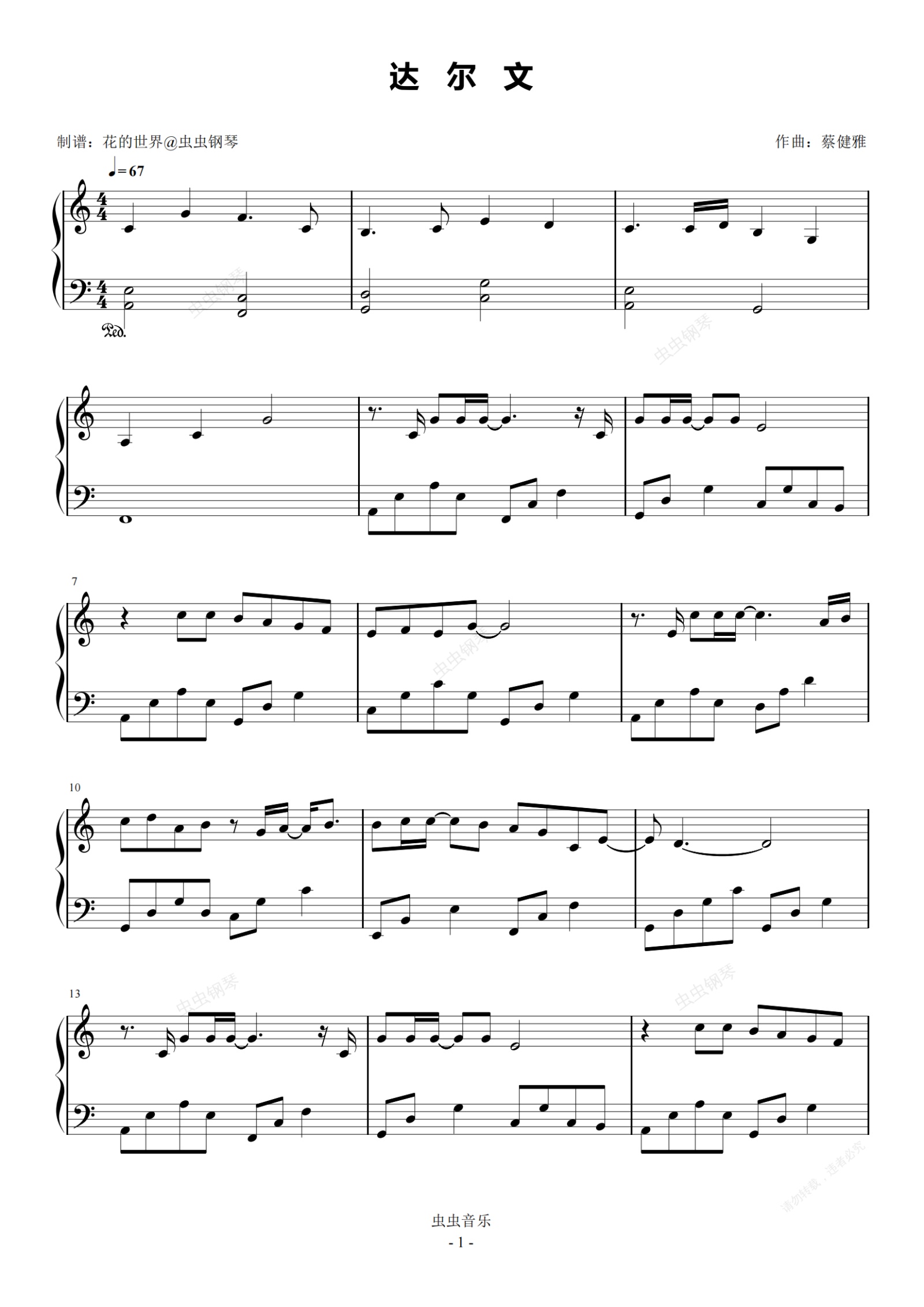 钢琴谱:达尔文 C调简易版 蔡健雅 林俊杰