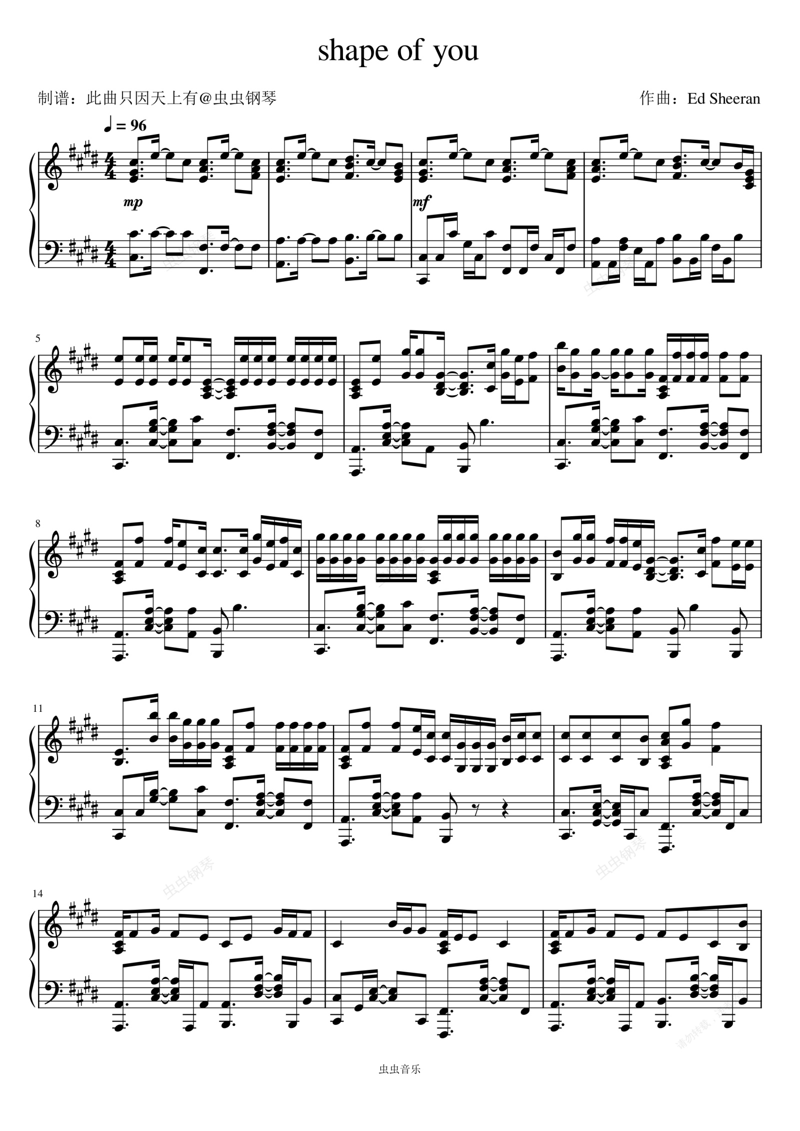 钢琴谱:Shape of you-Ed Sheeran 改调版