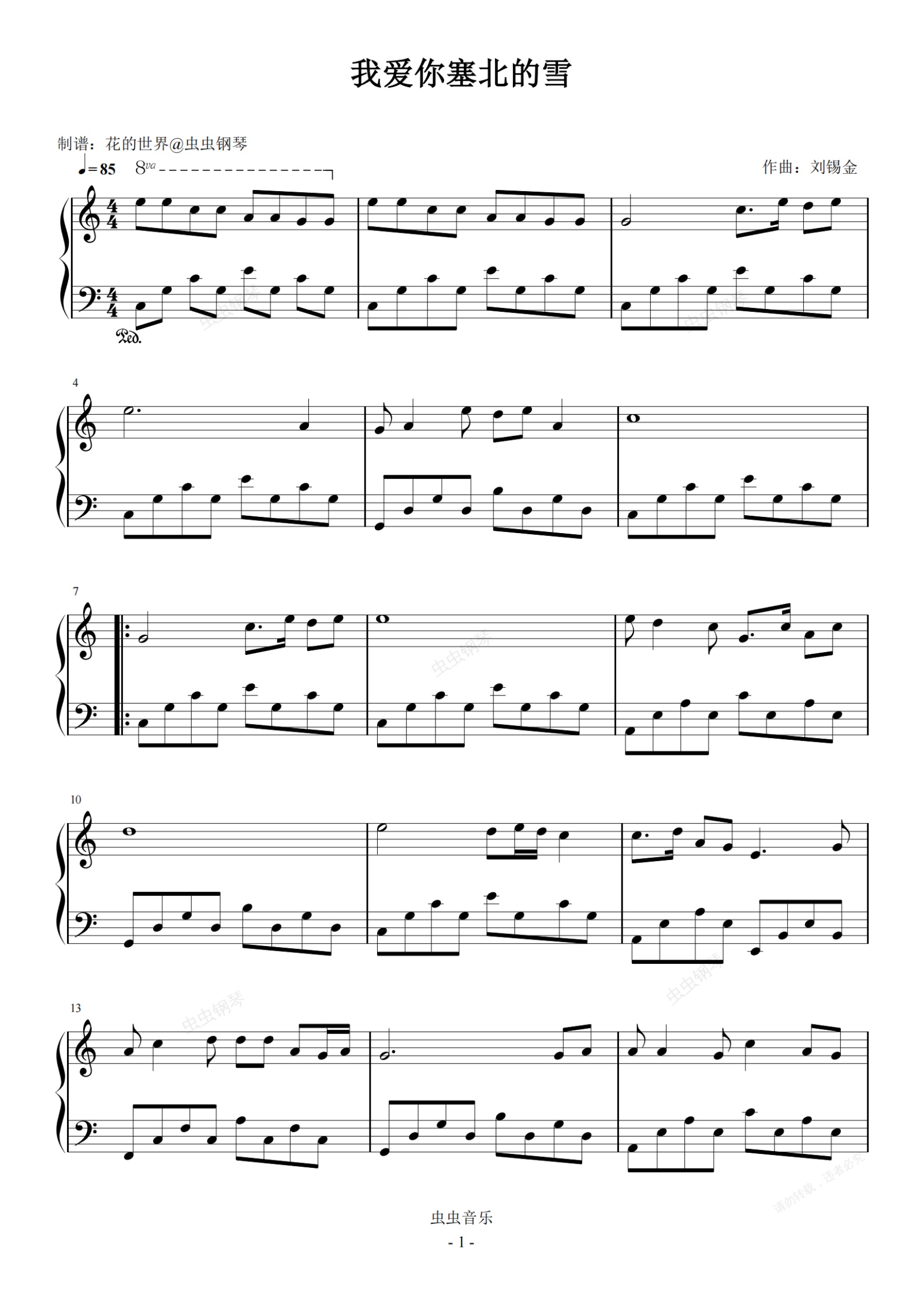 钢琴谱:我爱你塞北的雪 C调简易版 殷秀梅  经典流行