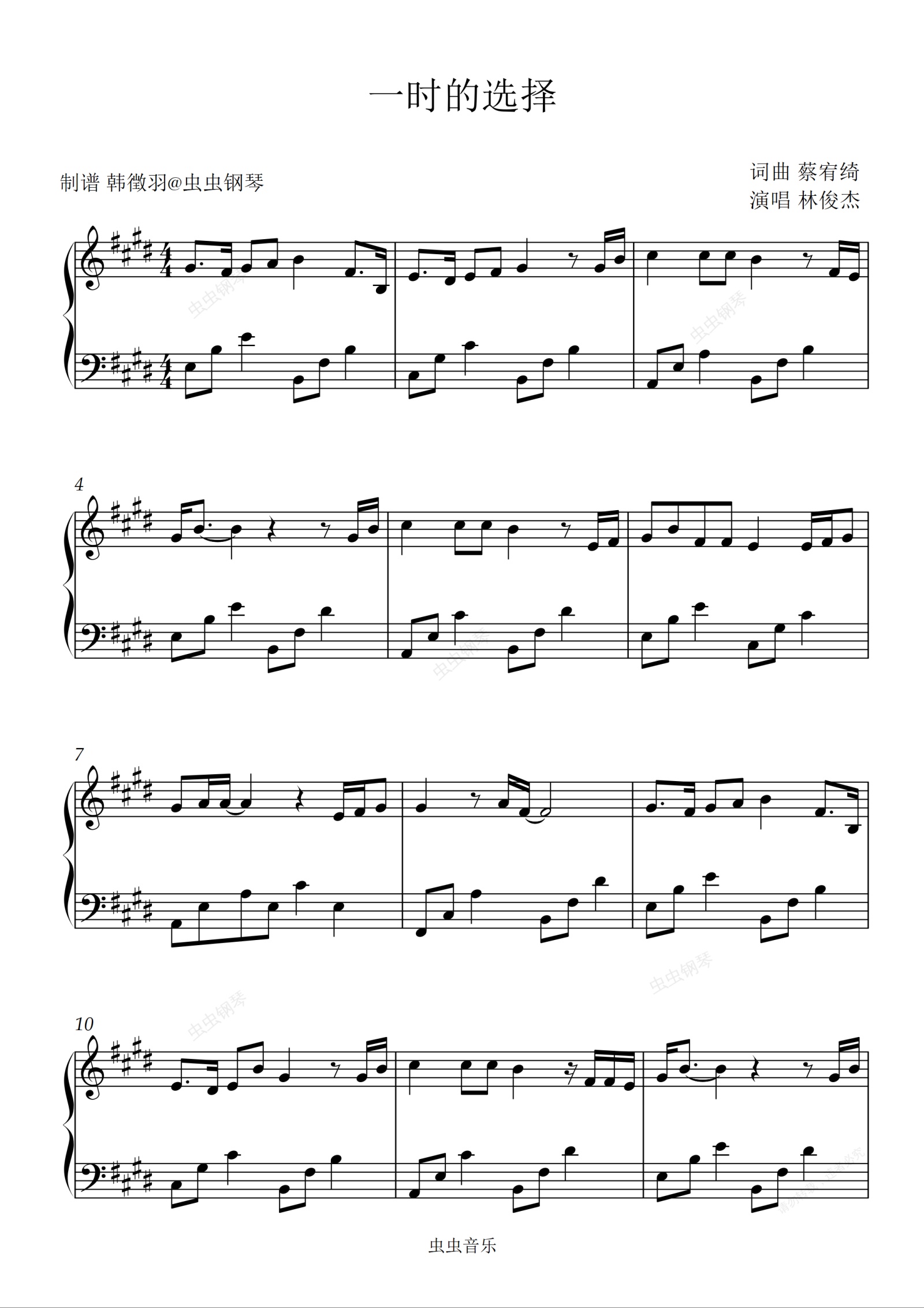 钢琴谱:一时的选择 林俊杰 原调E简易动听 适合初学者