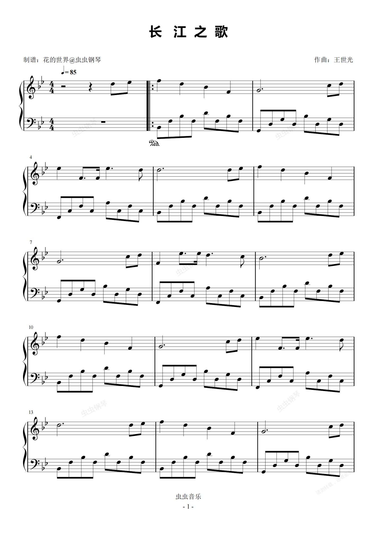 钢琴谱:长江之歌 原调简易版 殷秀梅  流行经典