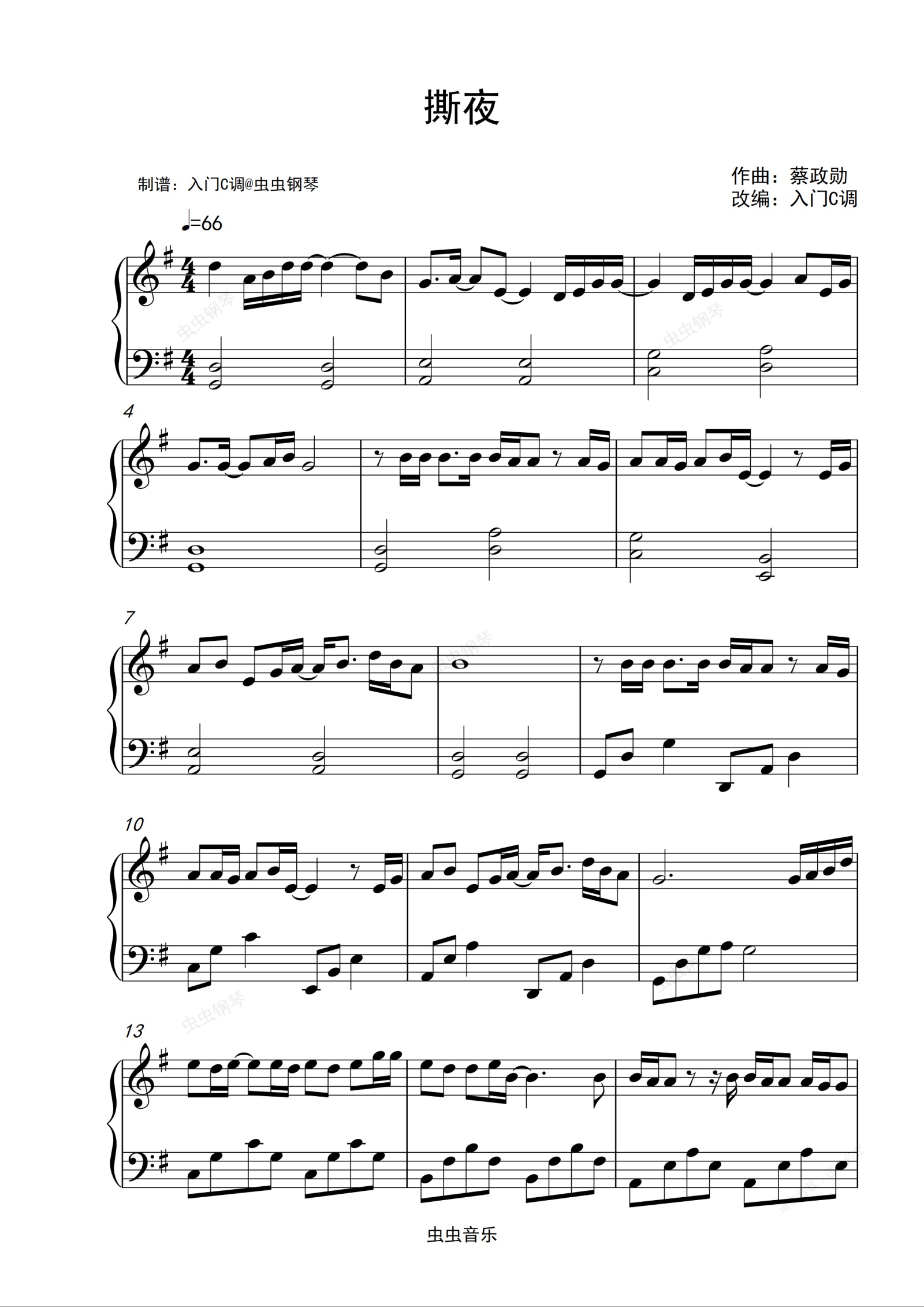 钢琴谱:阿杜《撕夜》入门G调简单版