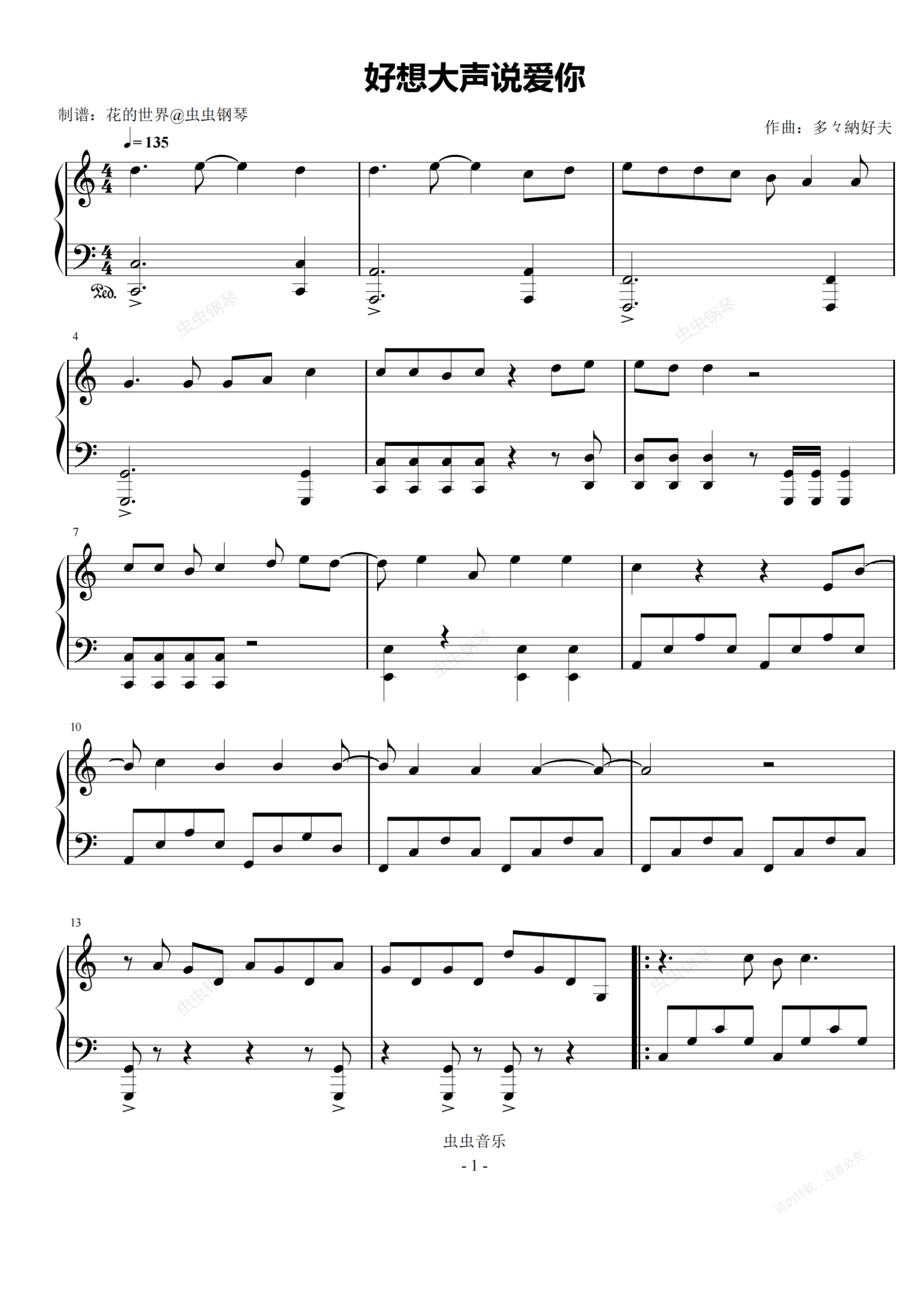 钢琴谱:好想大声说爱你 C调简易 灌篮高手 经典主题曲