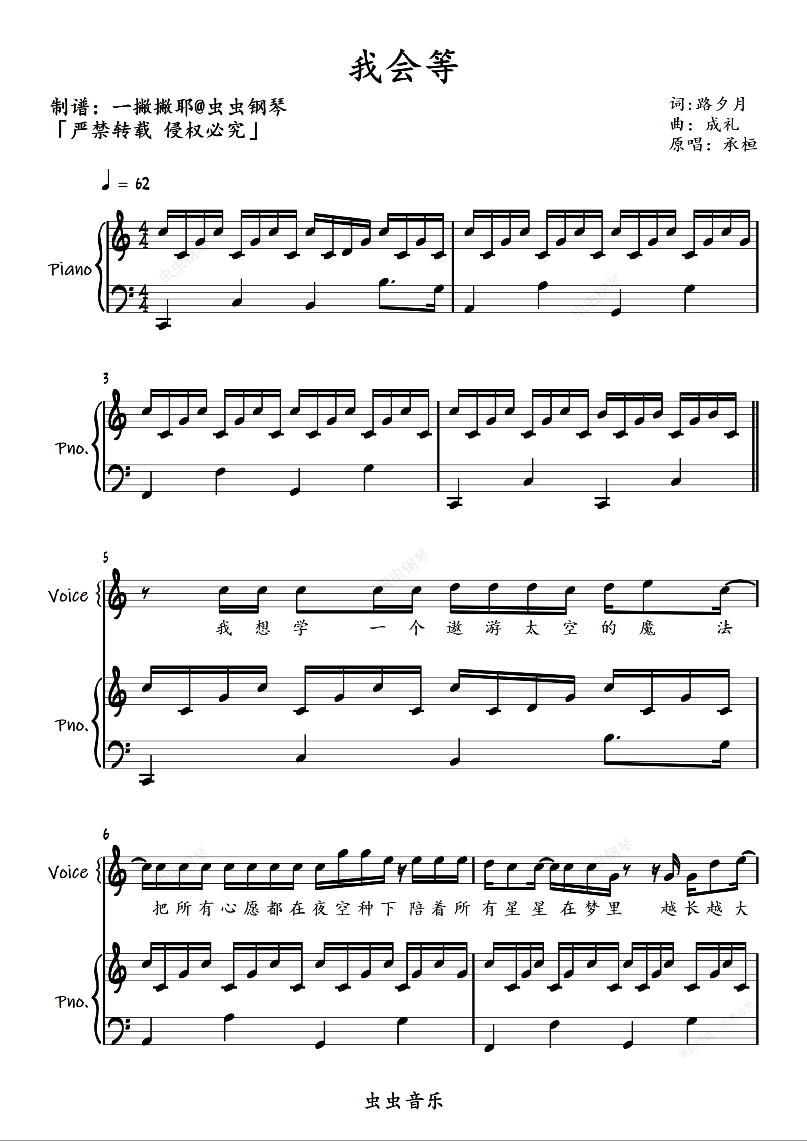 钢琴谱:C调女版弹唱《我会等》承桓「一撇撇耶」