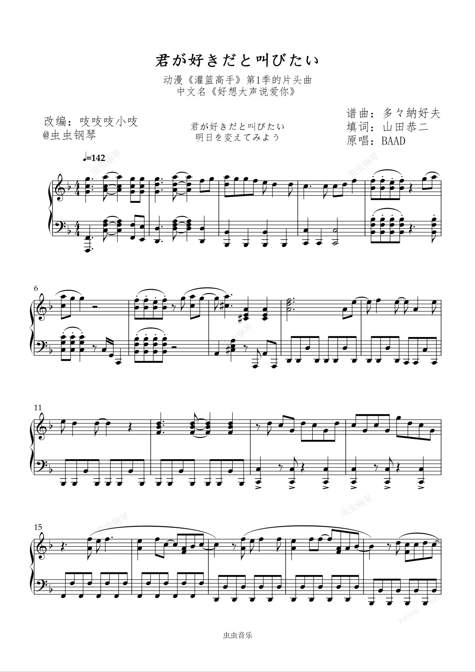 钢琴谱:好想大声说爱你 原调热血完整版 【中级难度】 有伴奏 吱吱编配 《灌篮高手》片头曲 君が好きだと叫びたい