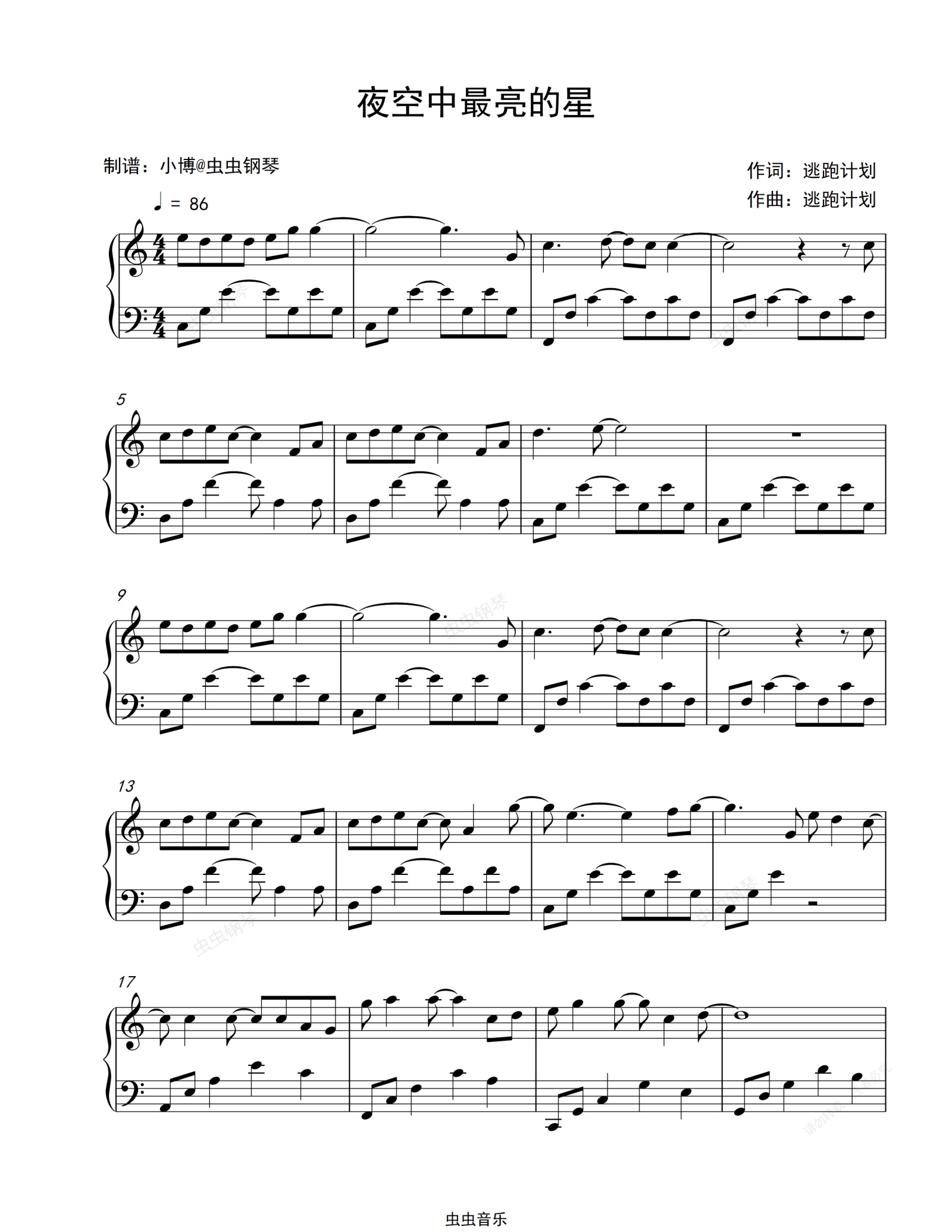 钢琴谱:夜空中最亮的星-C调简单版-逃跑计划