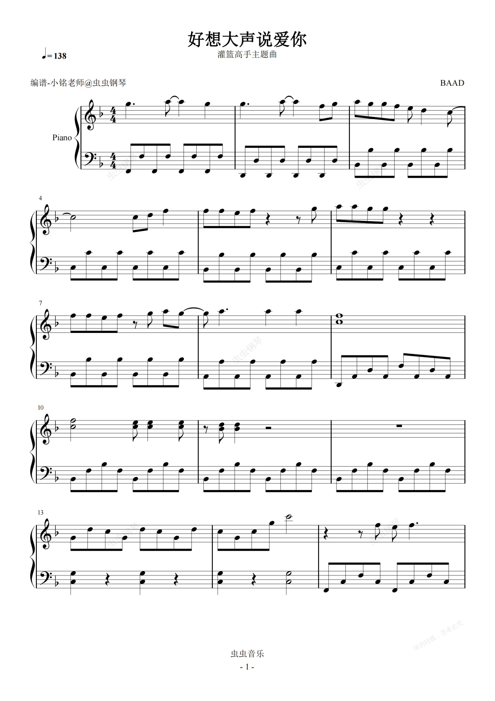 钢琴谱:灌篮高手【好想大声说爱你】简易
