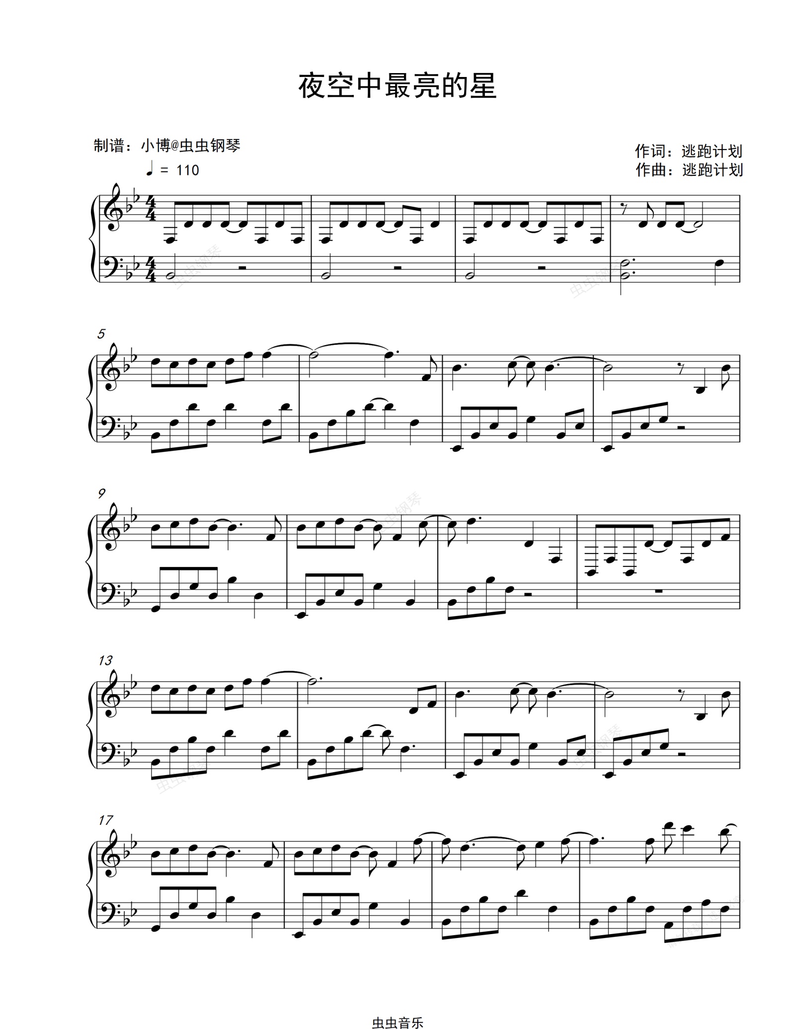 钢琴谱:夜空中最亮的星-摘星的你主题曲-完整版-逃跑计划