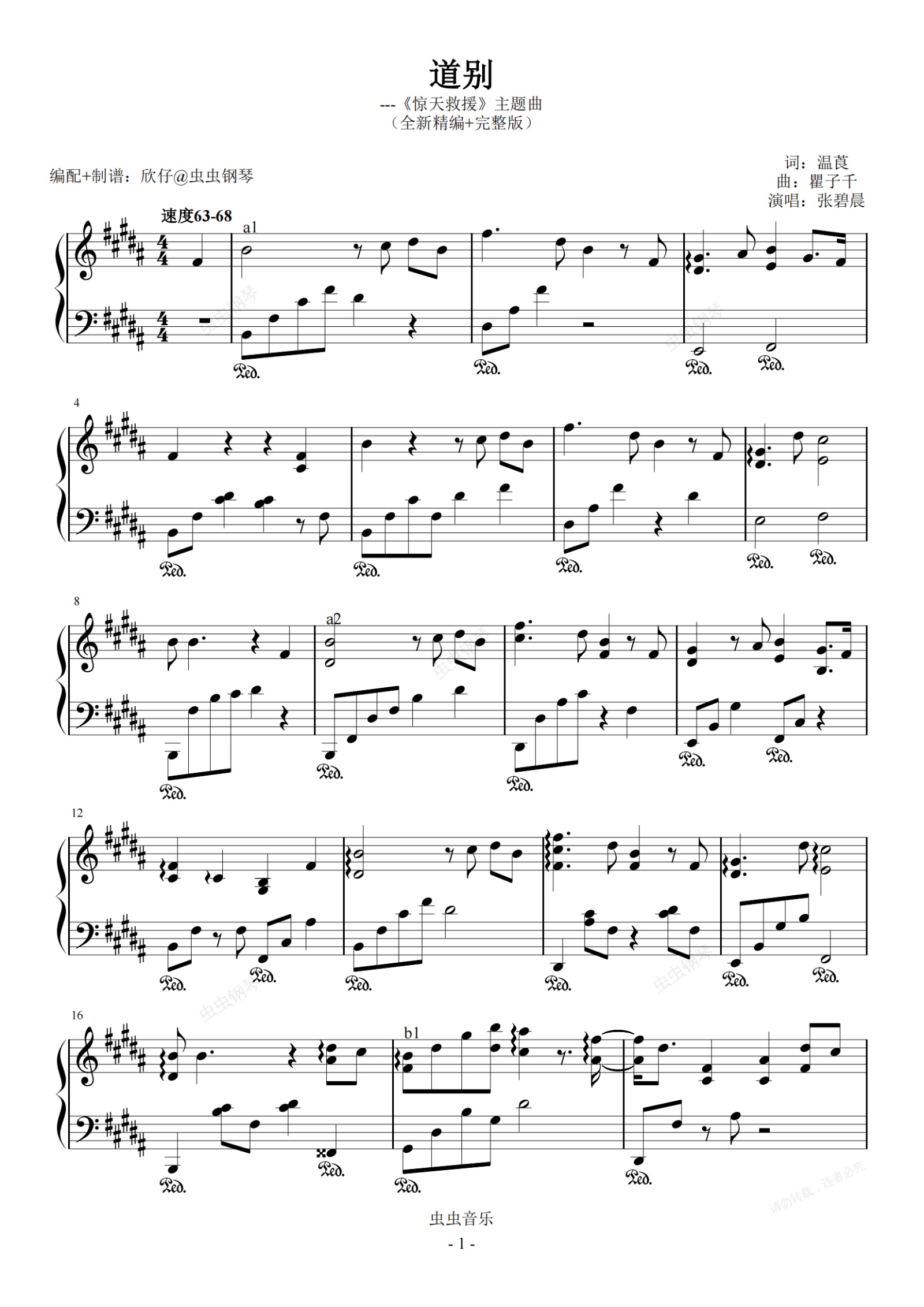 钢琴谱:张碧晨-B《道别》(《惊天救援》主题曲、完整版)