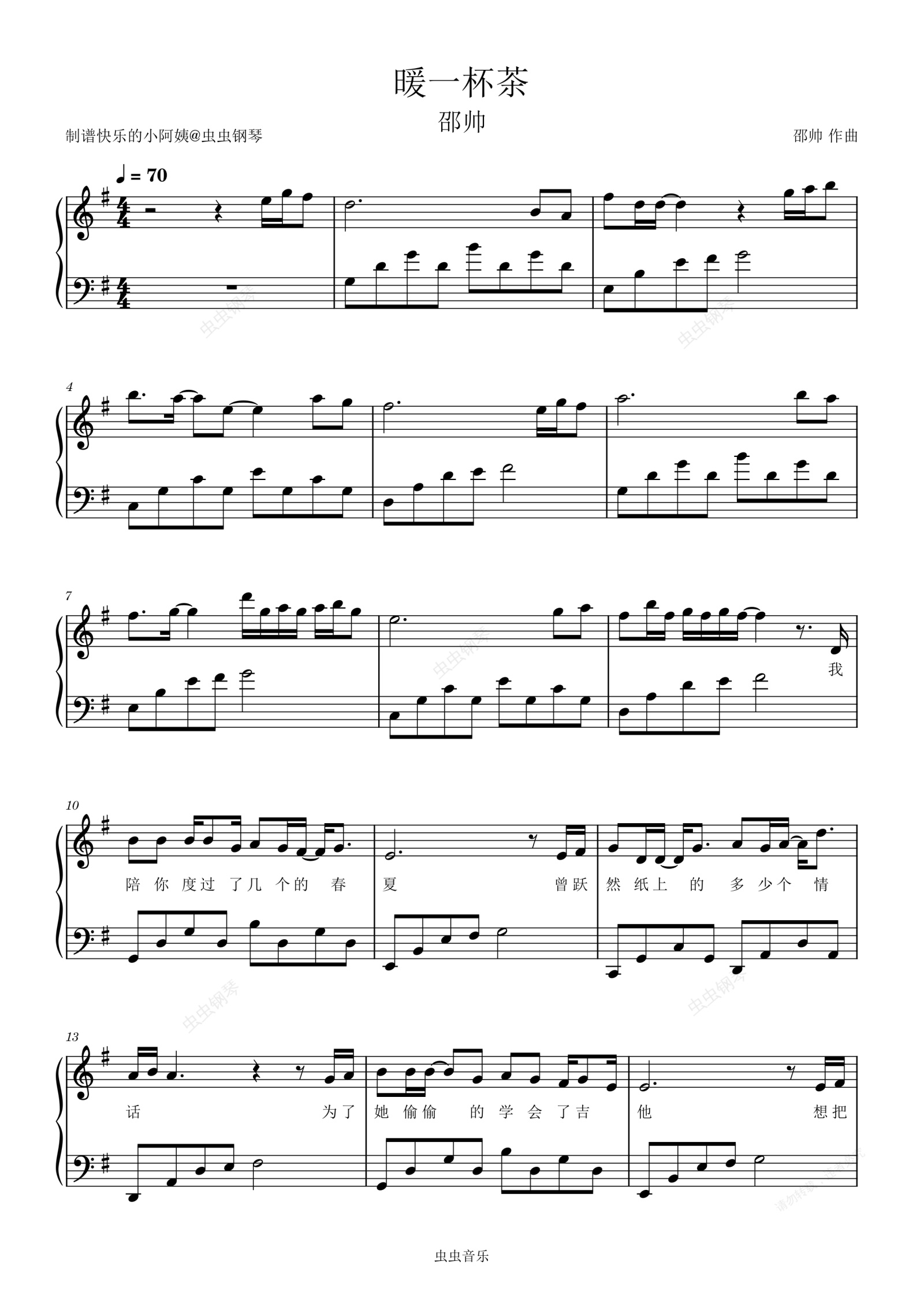 钢琴谱:暖一杯茶-简易带歌词 - 邵帅