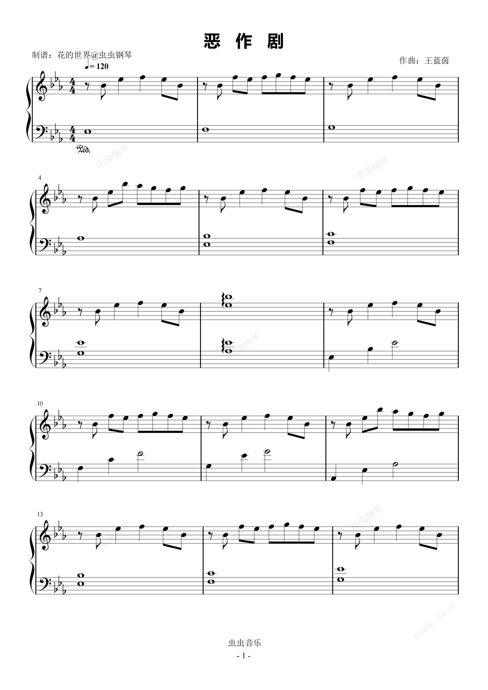 钢琴谱:恶作剧  原调简易版 王蓝茵