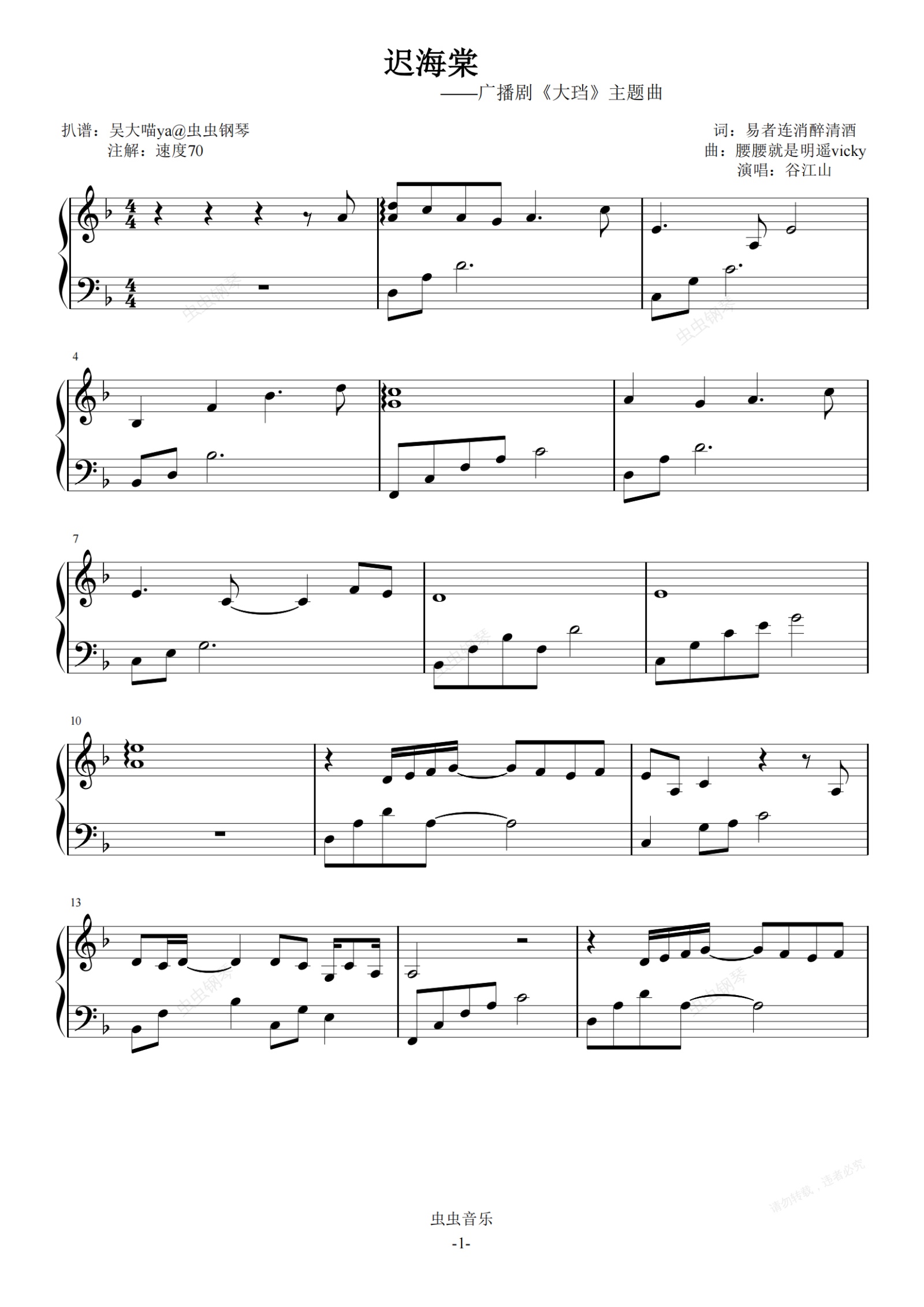钢琴谱:《迟海棠》—广播剧《大珰》主题曲 原调
