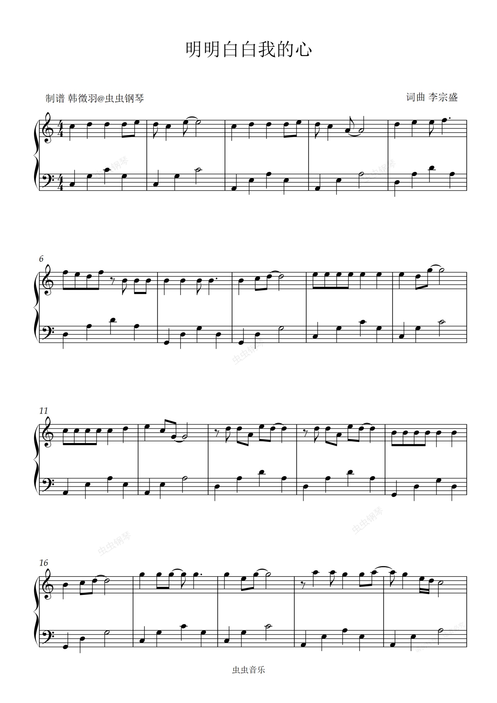 钢琴谱:明明白白我的心 简单易弹 适合初学者