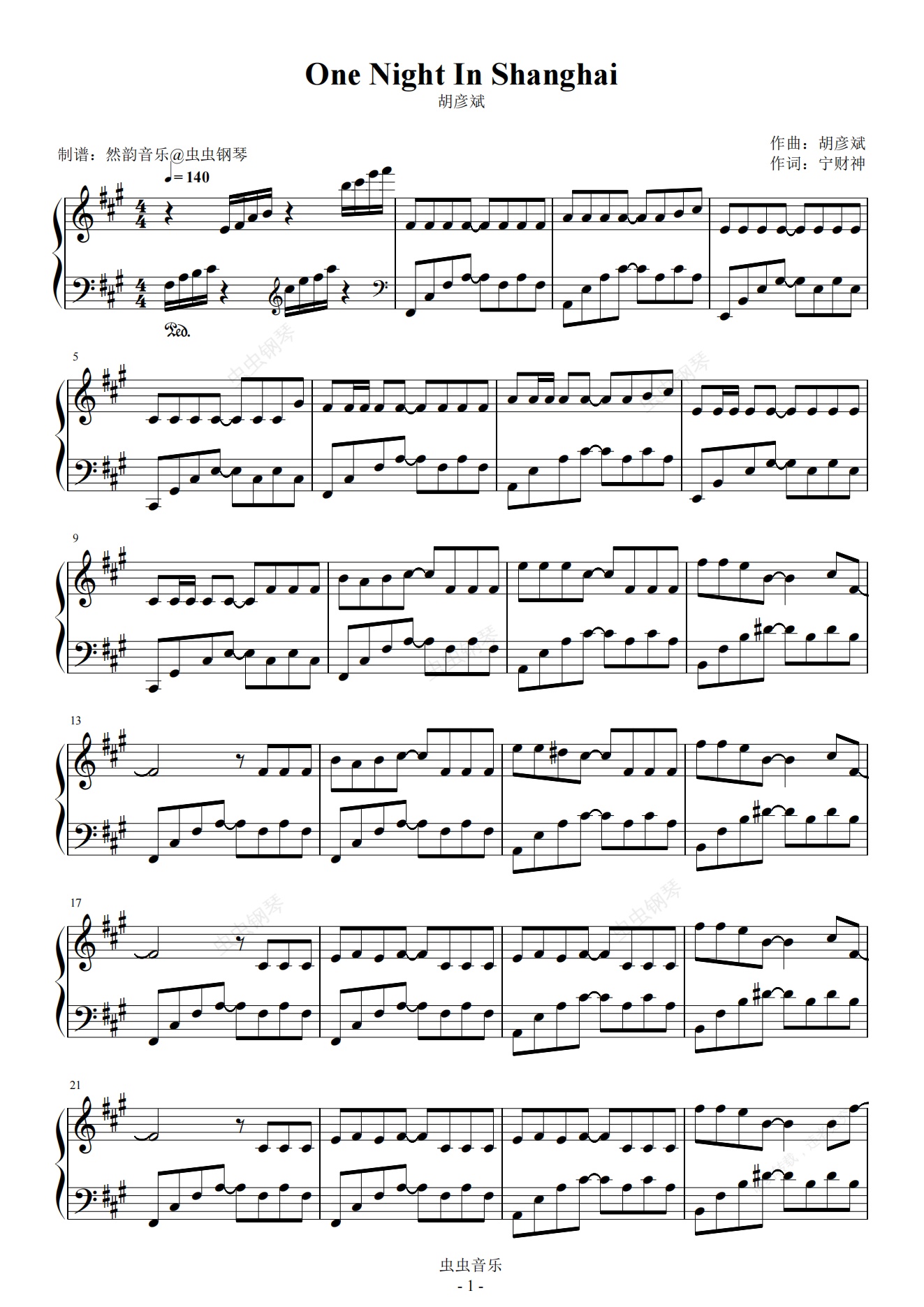 钢琴谱:【原调】One Night In Shanghai-胡彦斌 钢琴完美还原