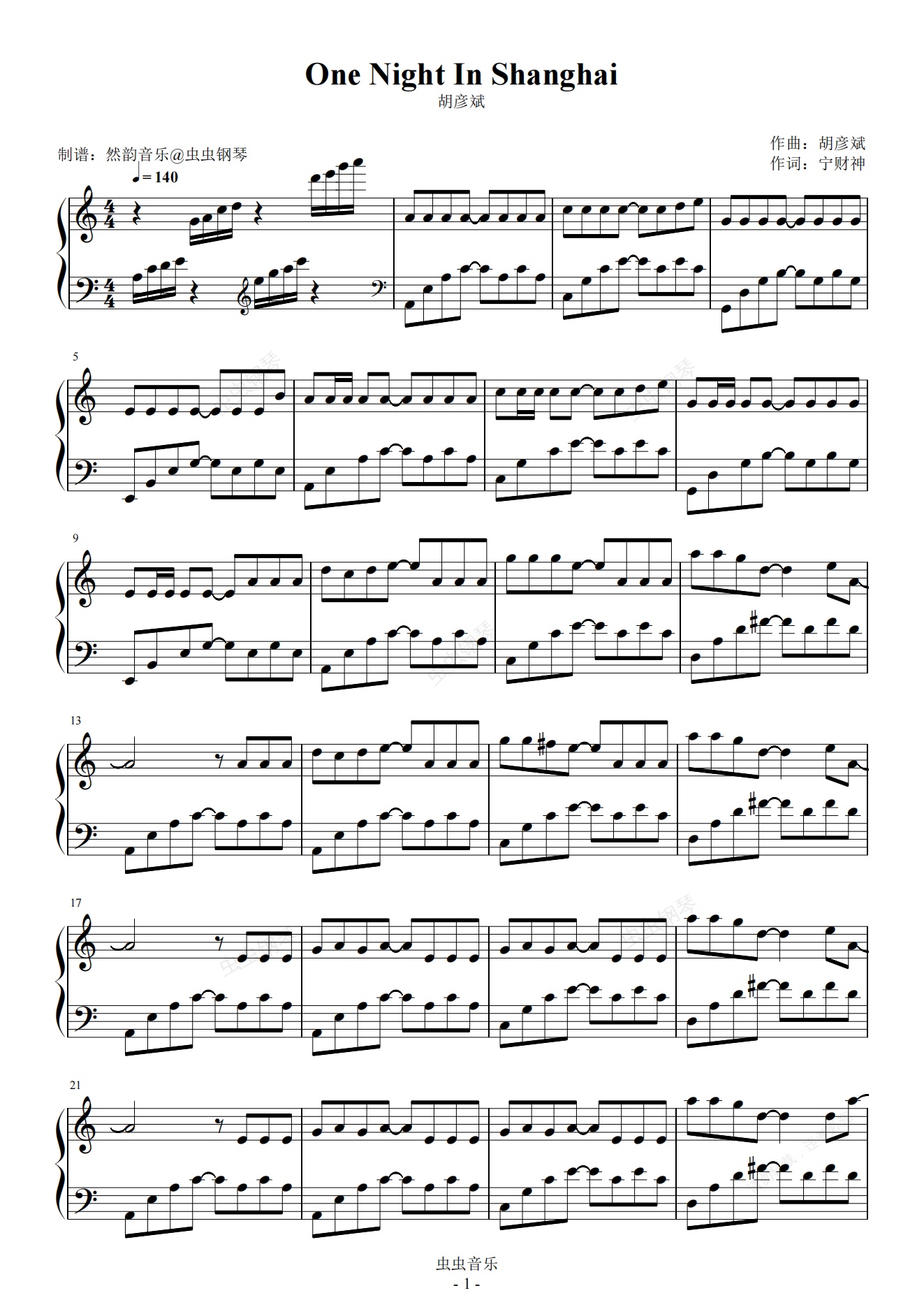 钢琴谱:【C调】One Night In Shanghai-胡彦斌 钢琴完美还原