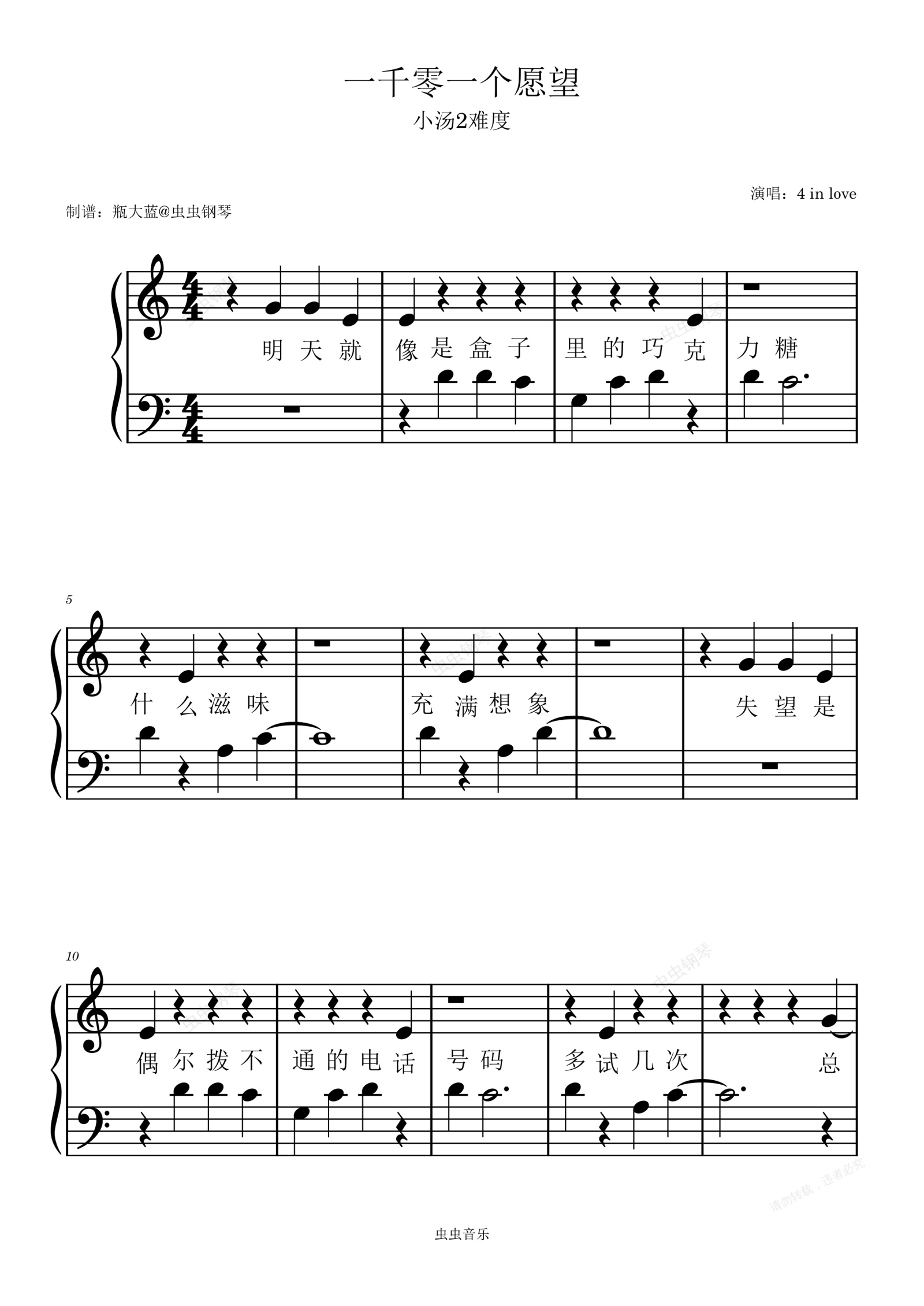 钢琴谱:《一千零一个愿望》-小汤2难度