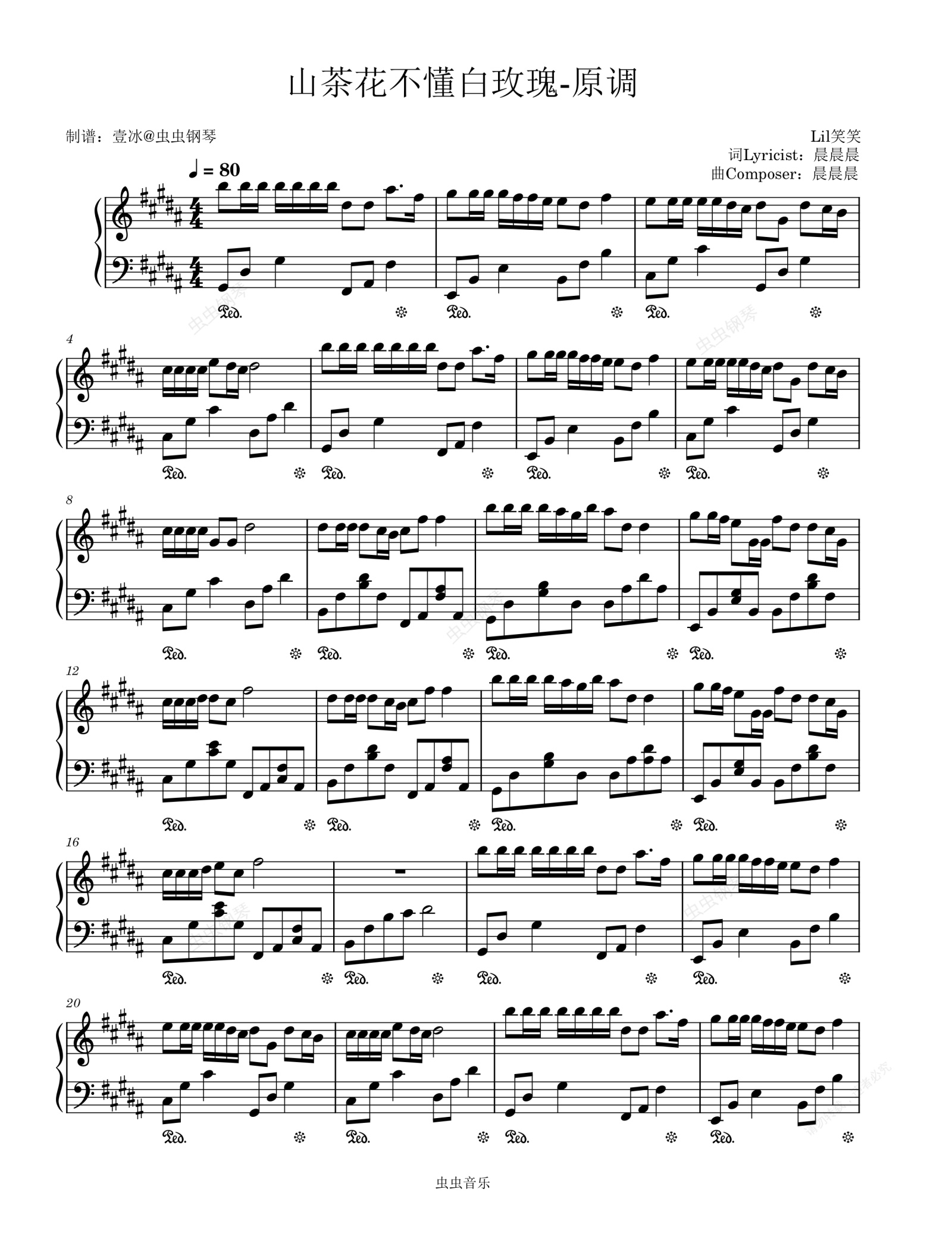 钢琴谱:山茶花读不懂白玫瑰//Lil笑笑-原调