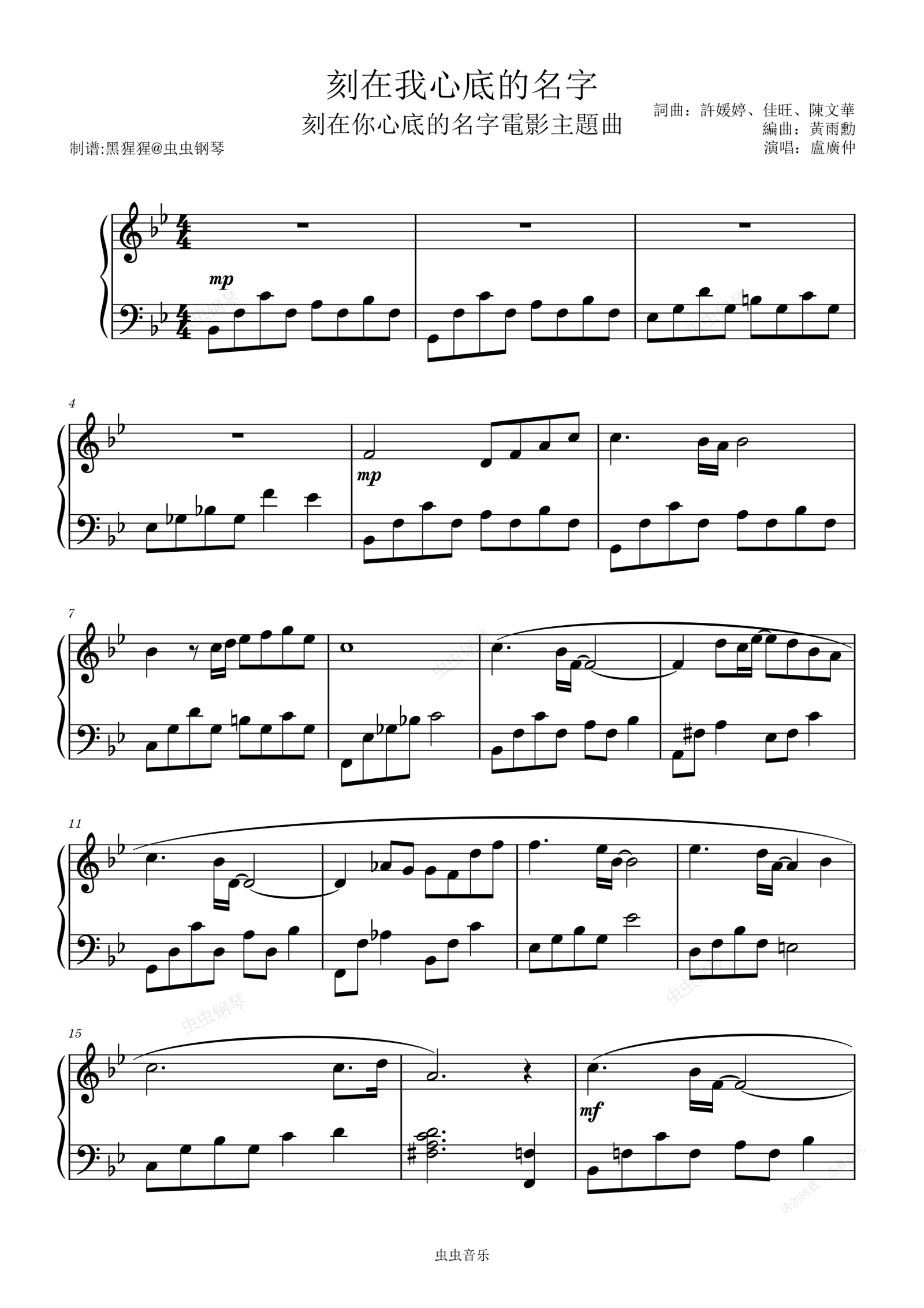 钢琴谱:卢广仲-Bb调 《刻在你心底的名字》