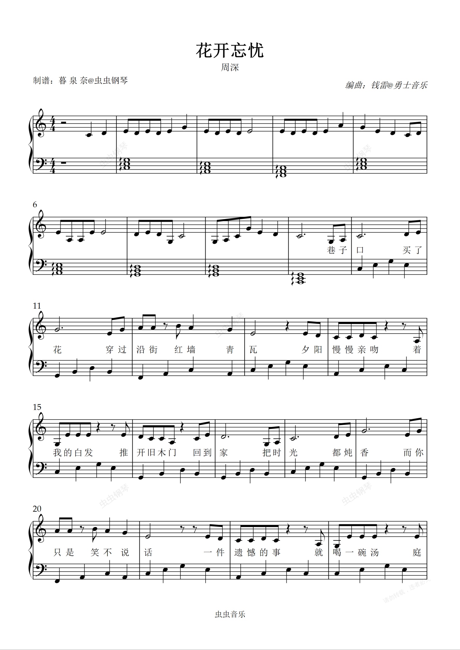 钢琴谱:花开忘忧(C调带歌词)