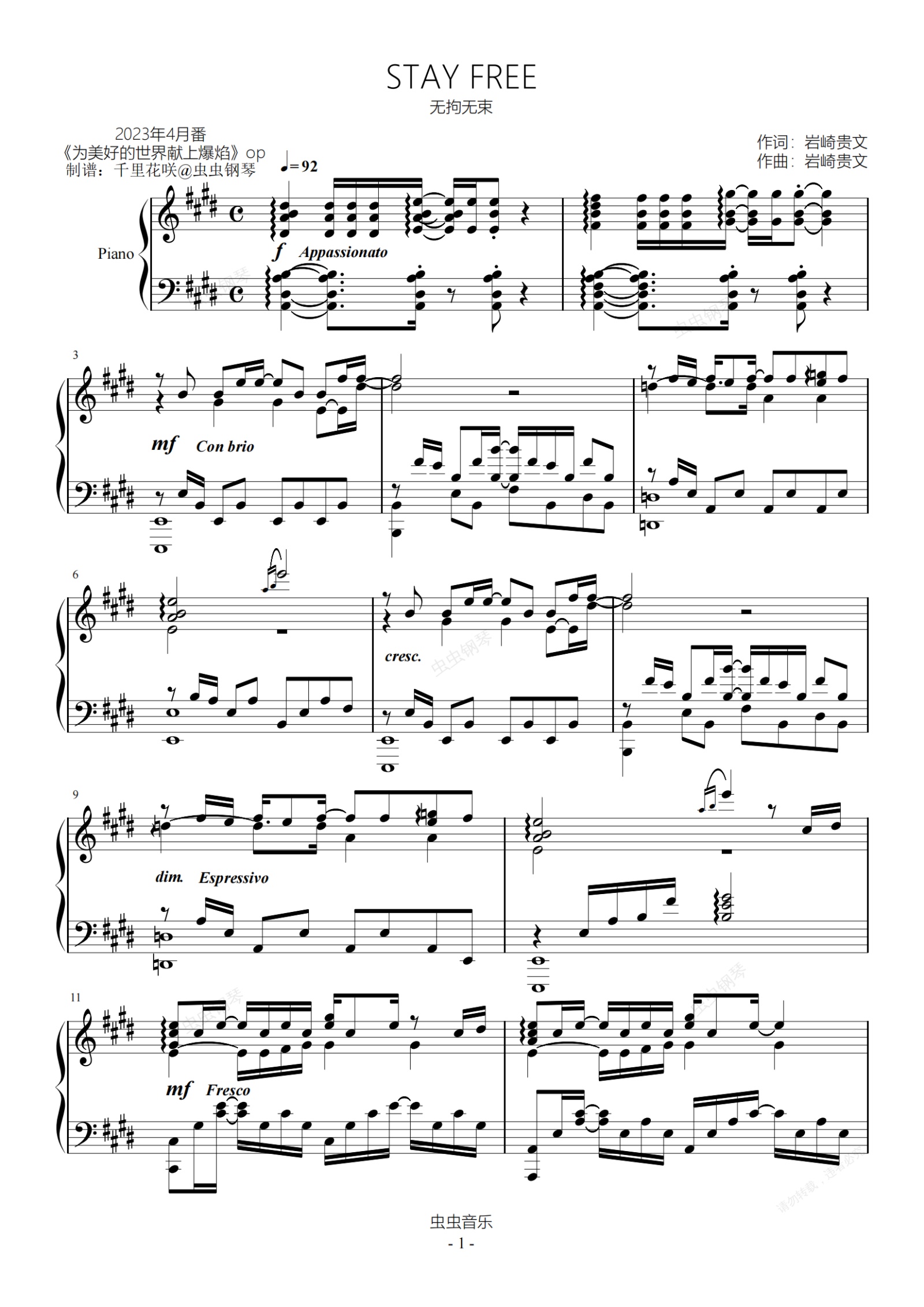钢琴谱:【4月番】为美好的世界献上爆焰op~STAY FREE