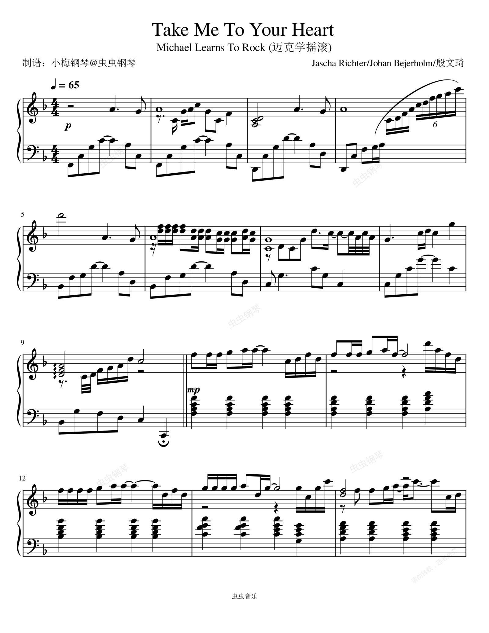 钢琴谱:Take Me to Your Heart - Michael Learns To Rock (迈克学摇滚)