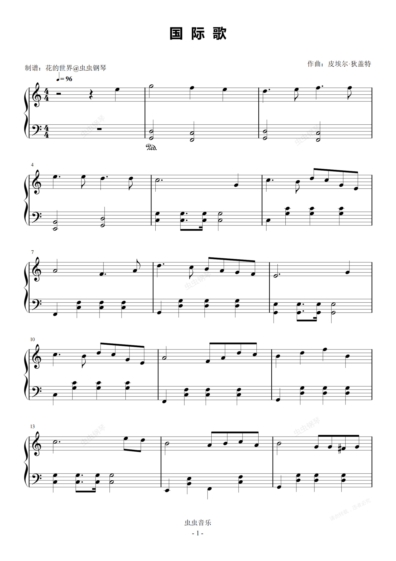 钢琴谱:国际歌 C调简易版 皮埃尔·狄盖特