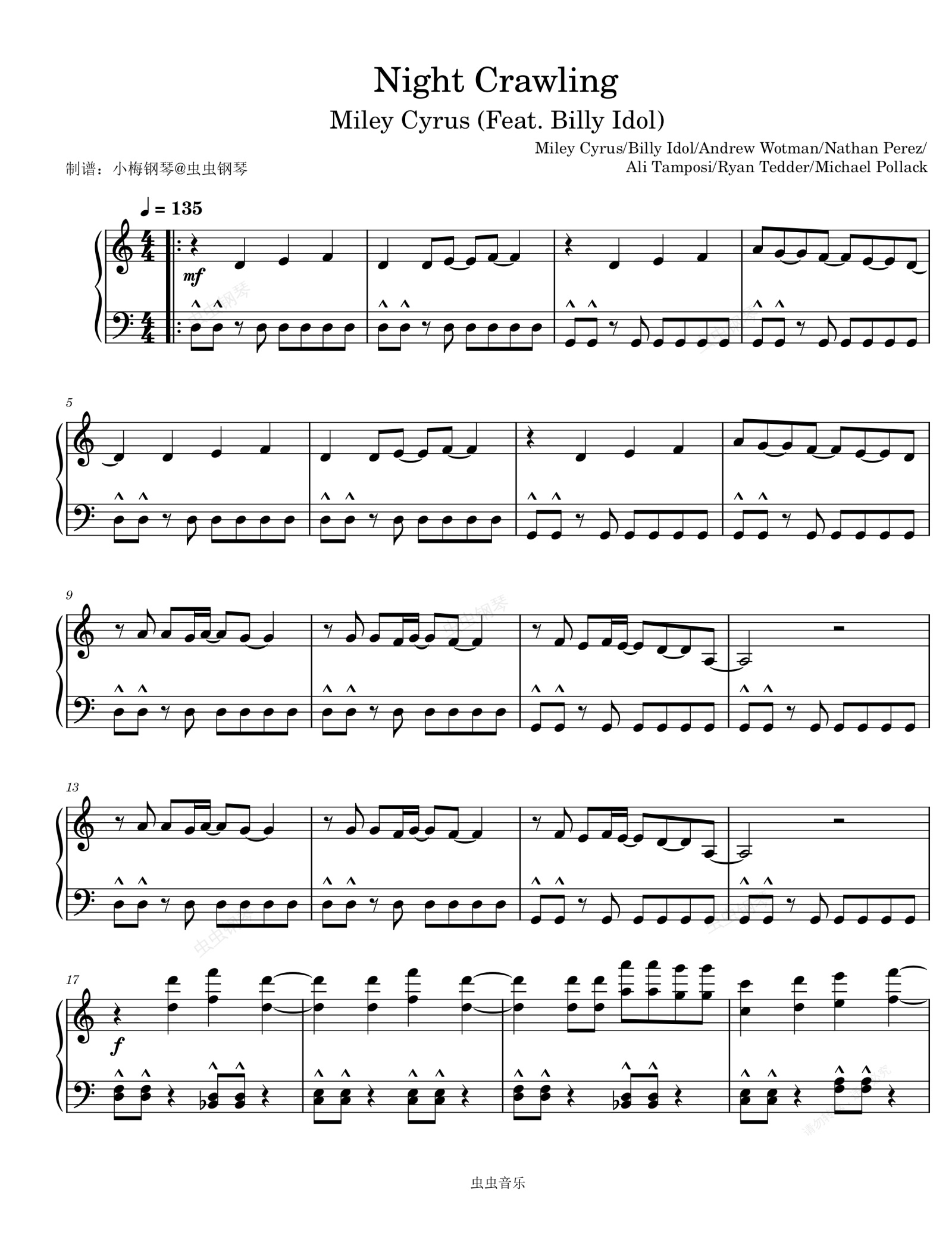 钢琴谱:Night Crawling - Miley Cyrus (麦莉·赛勒斯)/Billy Idol