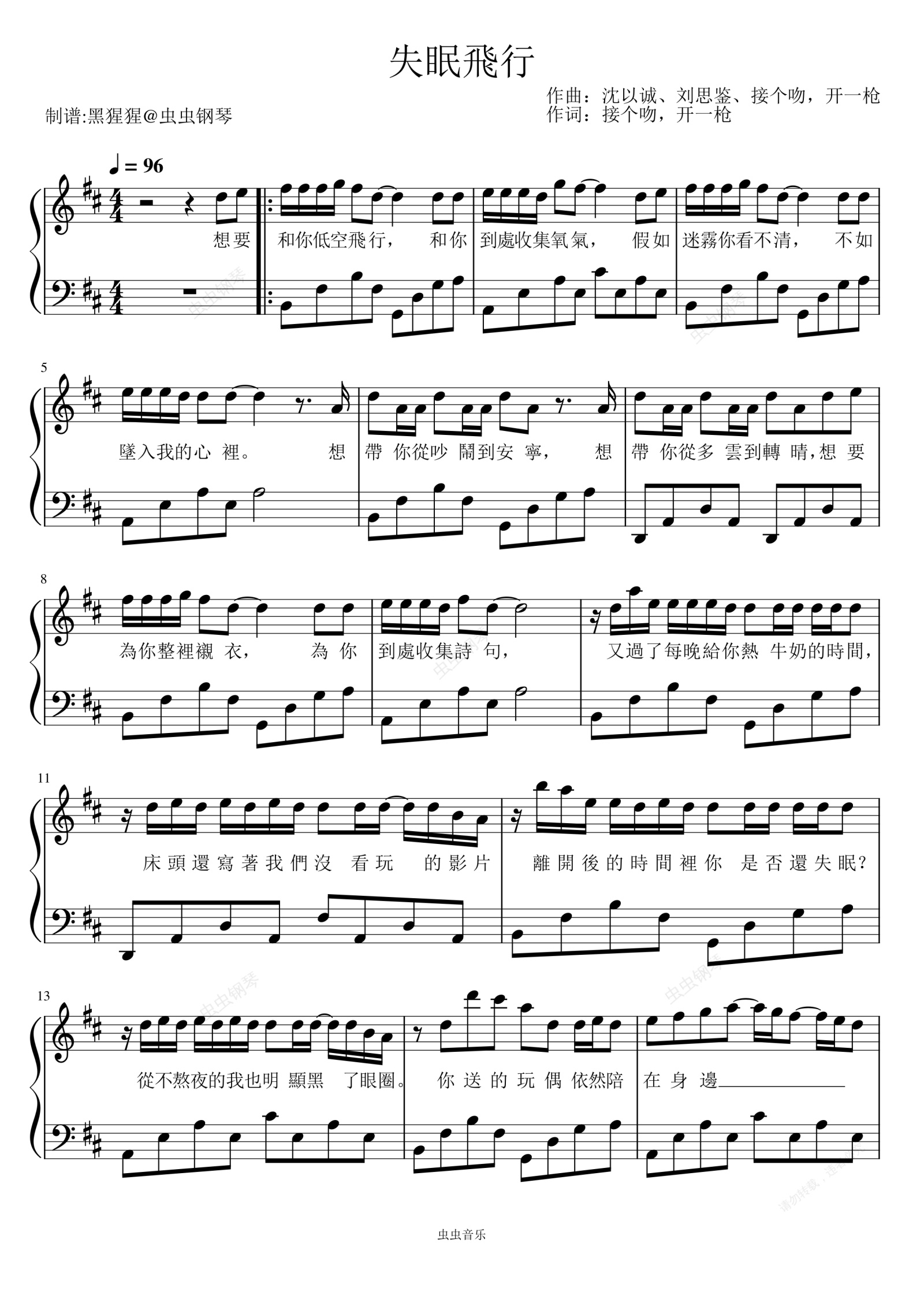 钢琴谱:接个吻,开一枪、 沈以诚 、薛明媛-D调 《失眠飞行》