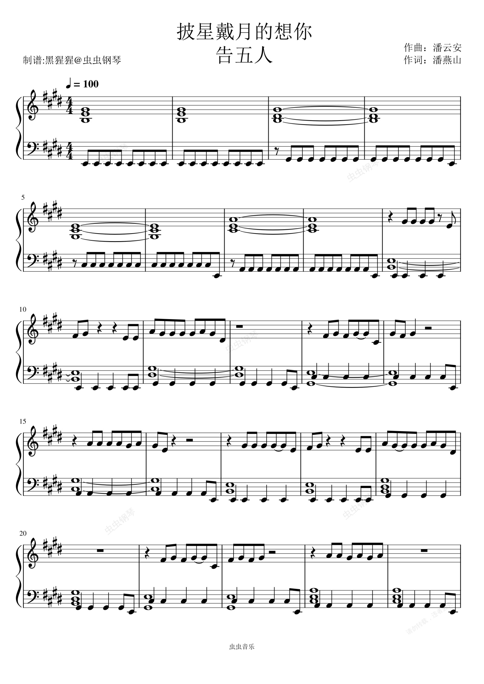 钢琴谱:告五人-E调 《披星戴月的想你》