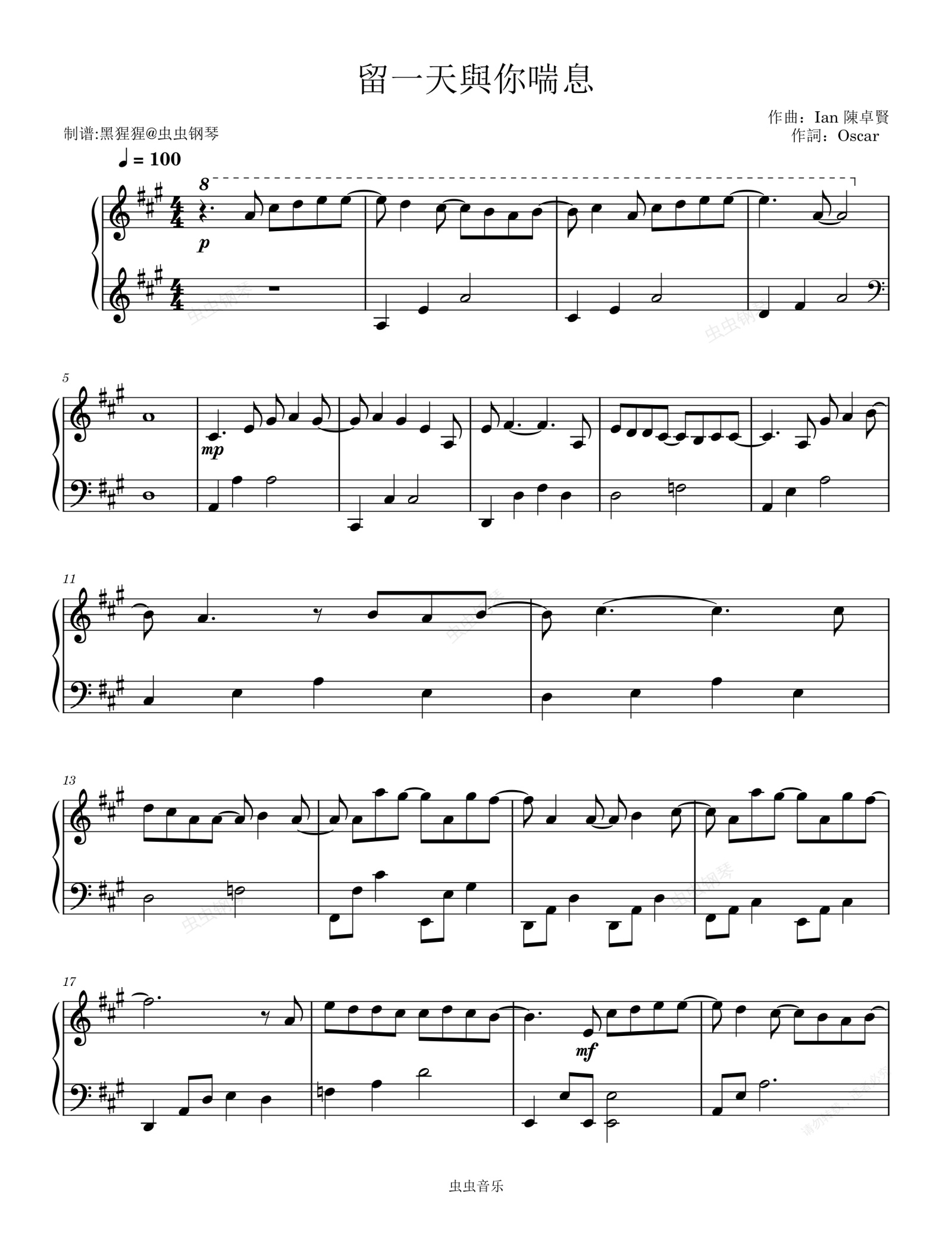 钢琴谱:陈卓贤-A调 《留一天与你喘息》