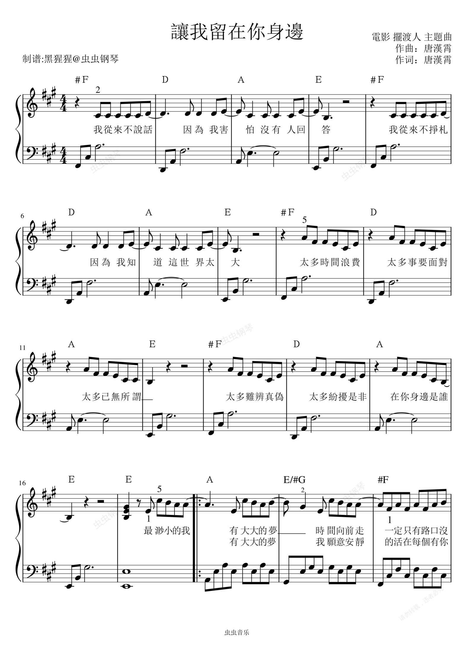 钢琴谱:陈奕迅-A调 《让我留在你身边(加歌词_和弦)》
