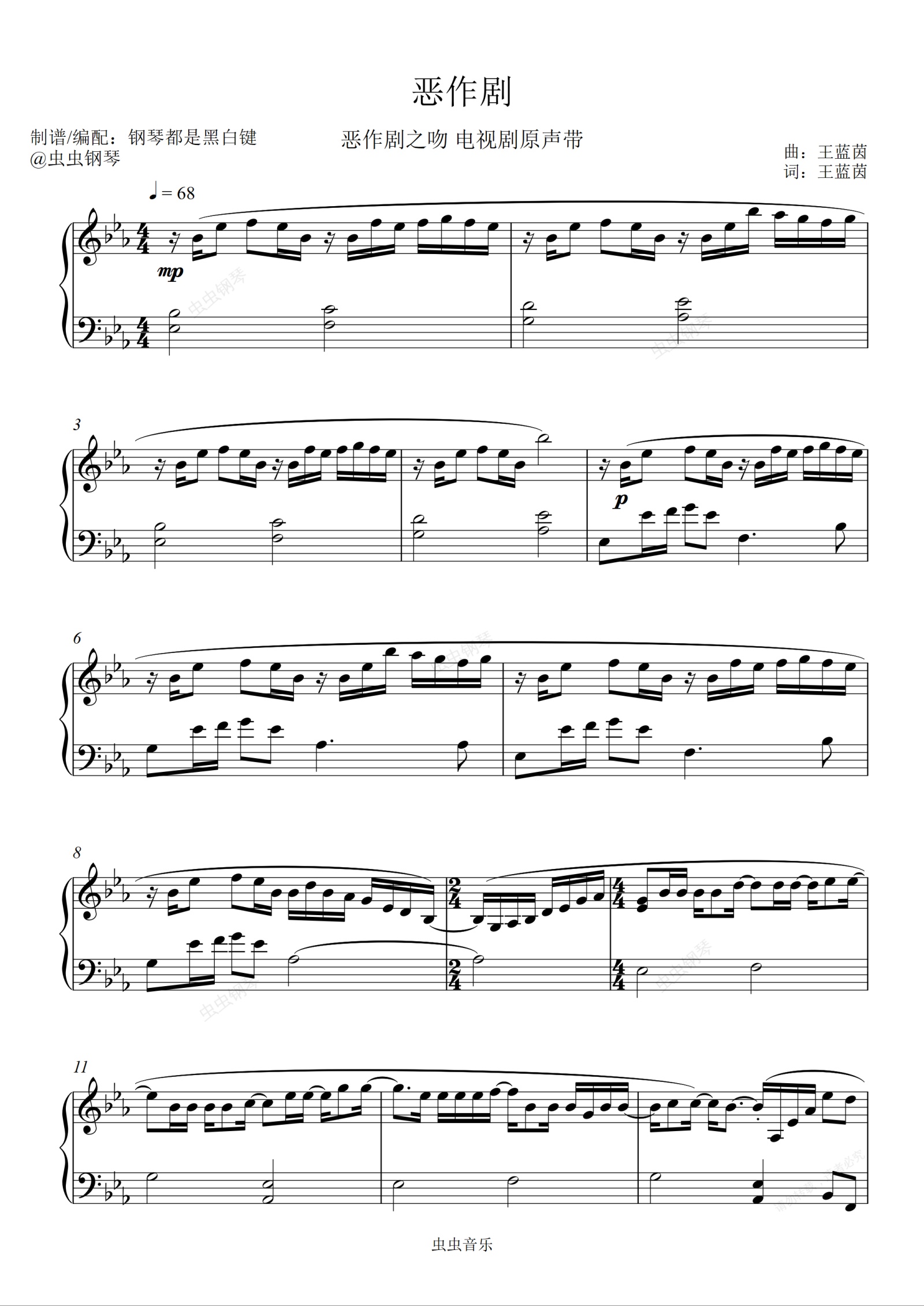 钢琴谱:《恶作剧》-王蓝茵 “我想我已慢慢喜欢你 因为我