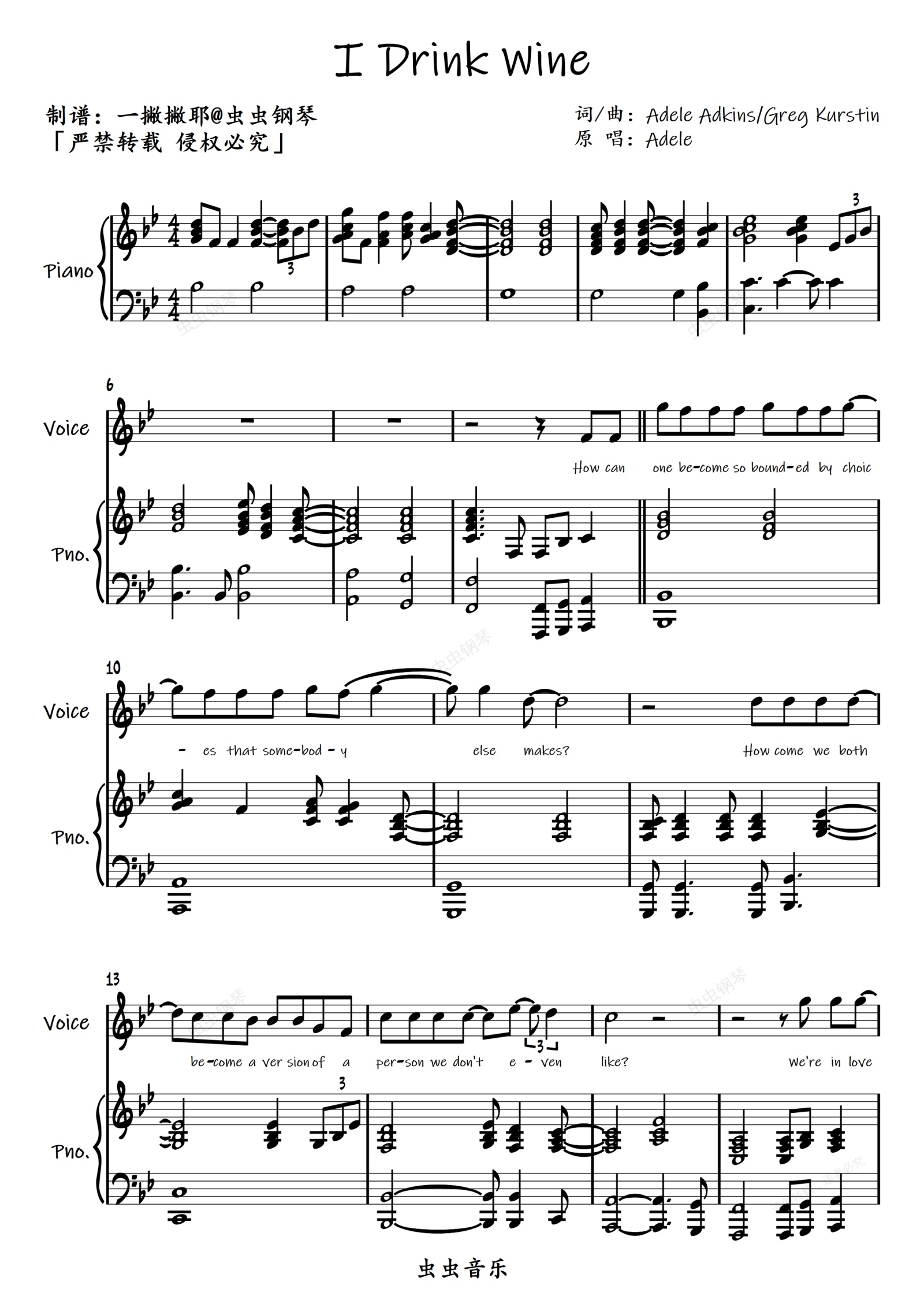 钢琴谱:I Drink Wine【弹唱谱】Adele「一撇撇耶」