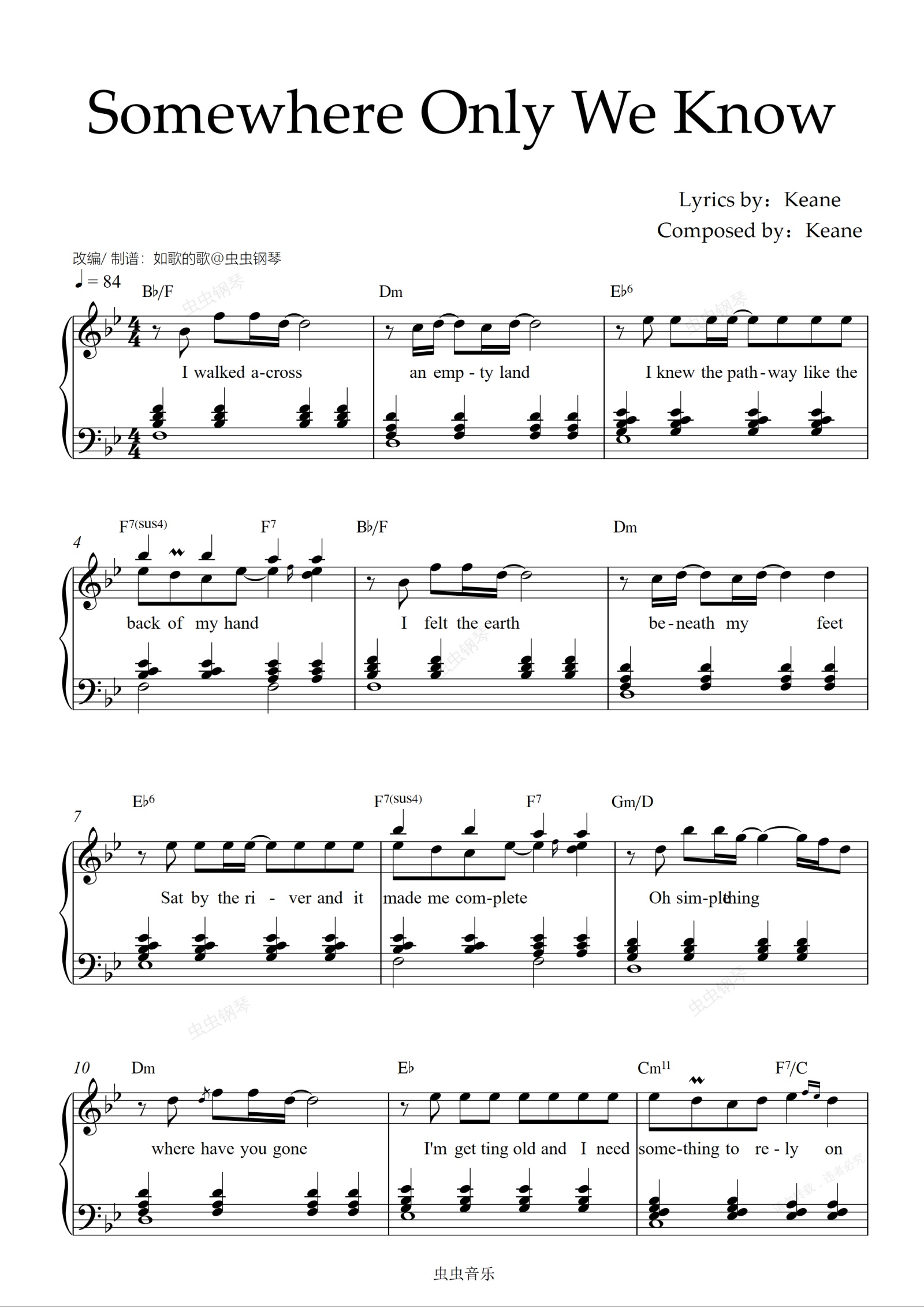Somewhere Only We Know-Rhianne降B易奏弹唱版