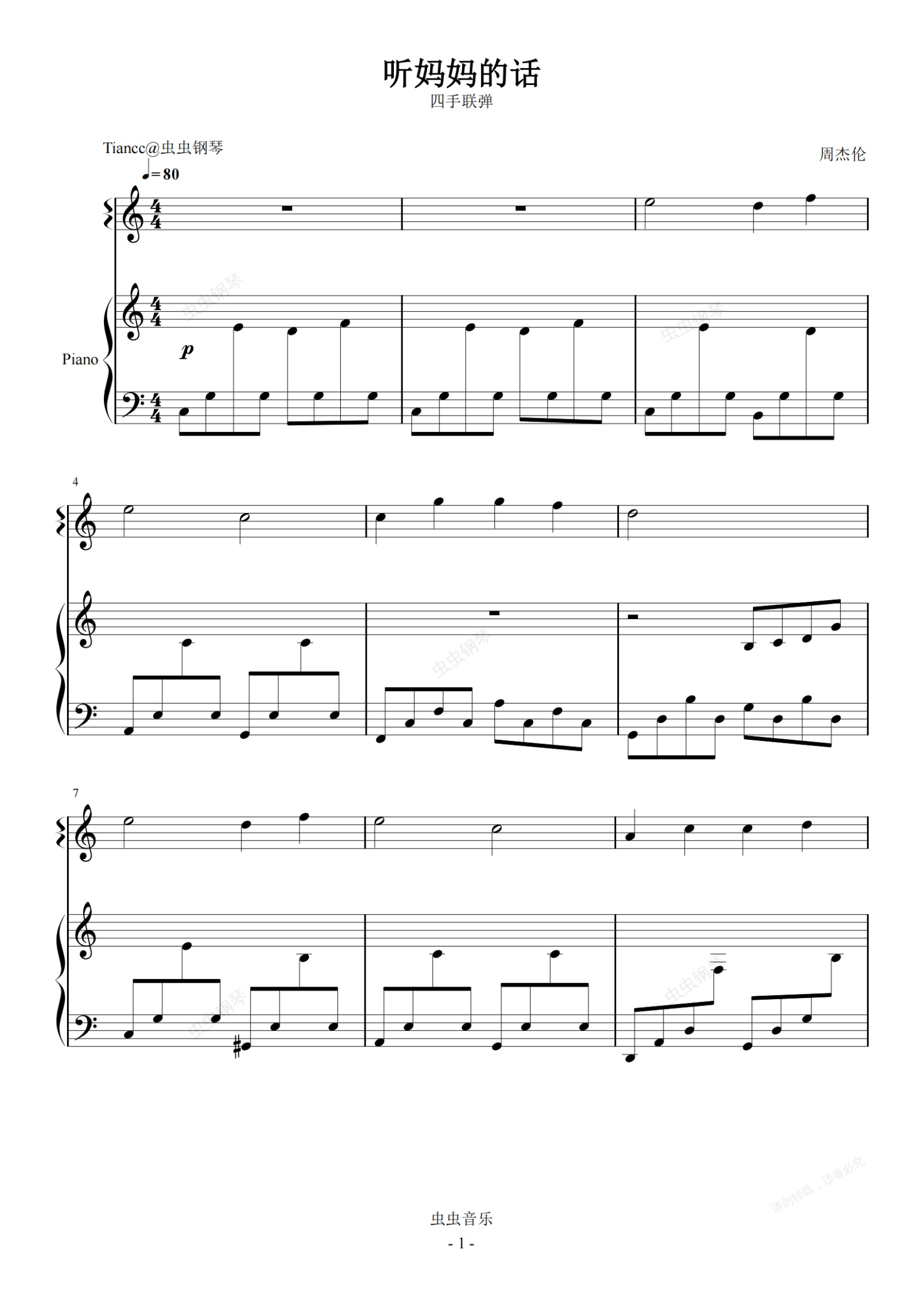 钢琴谱:《听妈妈的话》四手联弹,C调初学者专用