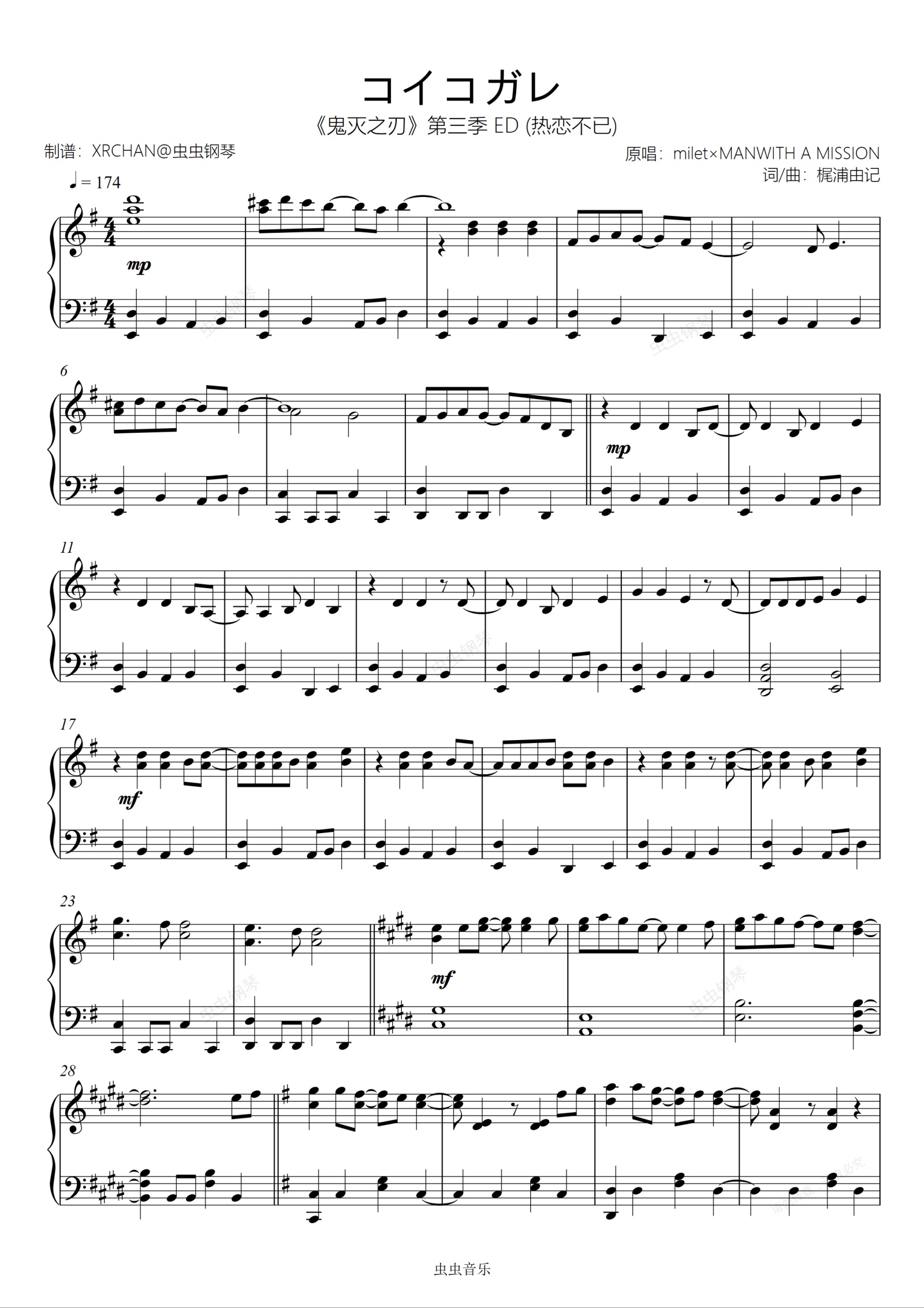 钢琴谱:コイコガレ 《鬼灭之刃》锻刀村篇 ED 初级
